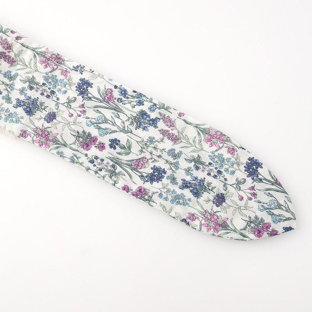 今治産タオル生地を使い、縫製も今治のタオルマフラー。ふんわりと肌ざわりがよく、洗濯を繰り返しても硬くなりにくいのが魅力です。吸水性があり、汗も吸います。水の気化熱でひんやり感じる、付属の冷んやりシートを内側のポケットに入れれば、日よけしながら心地よい涼しさに。リボンのようなかわいい見た目が特長で、首周りの内側のみタオル生地なのでかさばらず軽いつけごこち。結び目のように見える部分がループ状になっていて、もう一方の端をここに通すだけで、整ったリボンの形に決まります。ナチュラルな花柄で、ガーデニングや散歩、アウトドアなどの外出にもお使いいただけます。