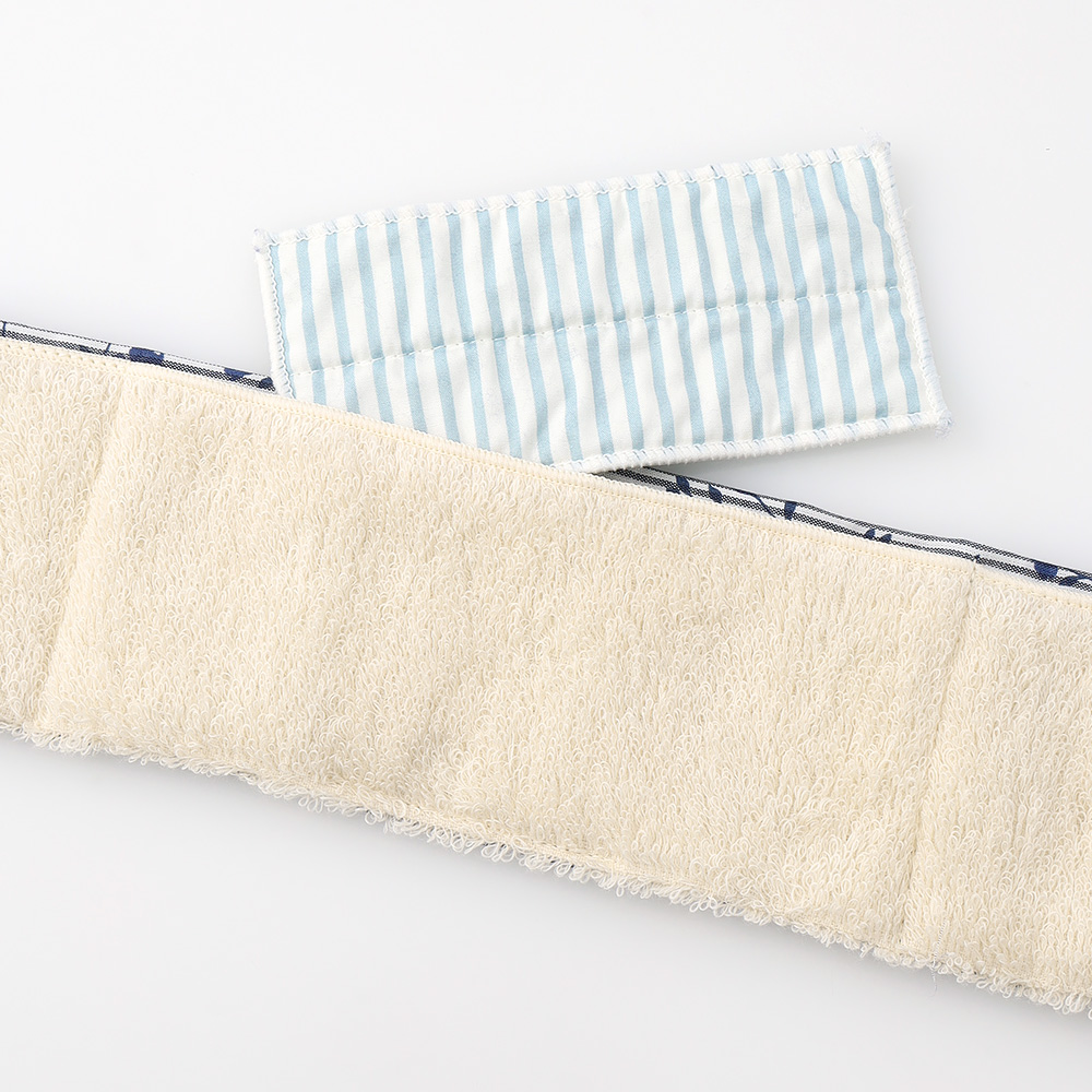 今治産タオル生地を使い、縫製も今治のタオルマフラー。ふんわりと肌ざわりがよく、洗濯を繰り返しても硬くなりにくいのが魅力です。吸水性があり、汗も吸います。水の気化熱でひんやり感じる、付属の冷んやりシートを内側のポケットに入れれば、日よけしながら心地よい涼しさに。リボンのようなかわいい見た目が特長で、首周りの内側のみタオル生地なのでかさばらず軽いつけごこち。結び目のように見える部分がループ状になっていて、もう一方の端をここに通すだけで、整ったリボンの形に決まります。ナチュラルな花柄で、ガーデニングや散歩、アウトドアなどの外出にもお使いいただけます。