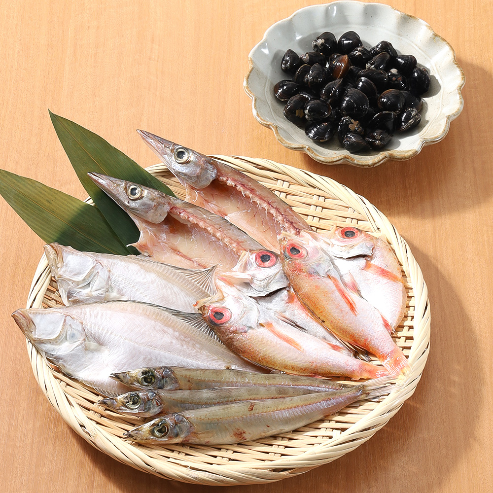 冷凍しじみ(250g)、ニギス(計100g)、かます2~3枚(計160g)、エテかれい2枚(計140g)、のどぐろ2枚(計100g)