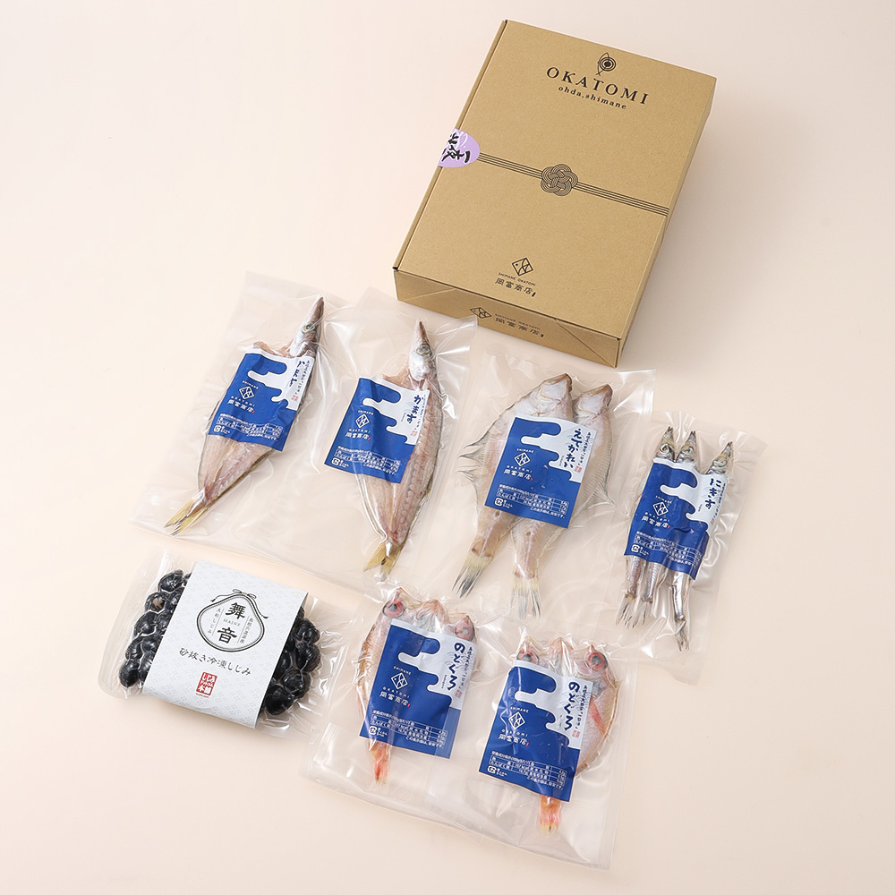 島根県沖「一日漁」で漁獲された魚を、買付から製造まで自社一貫体制で行うことで、原料の状態によって漬け込みや乾燥時間を調整し、品質を一定に保っています。加えるのは、塩だけ。<岡富商店>が目利きした魚で作る自慢の干物としじみのセットです。お魚好きはもちろん、お酒が好きな方にもおすすめの一夜干しギフトです。母の日掛け紙とカードをお付けしてお届けいたします。