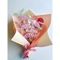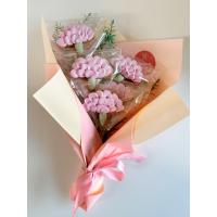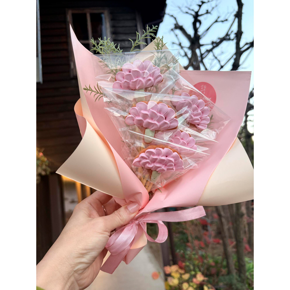 国産小麦クッキーの土台にストロベリーとビーツ、抹茶を使ったメレンゲをトッピングしたカーネーションのデザインクッキー5個を花束のようにラッピングしました。