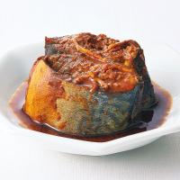 北海道近海で獲れる新鮮なさばを使用。濃厚な味わいの八丁味噌を使ったタレと一緒に煮込みました。