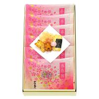 さくら:海老入りの塩サラダ味のお煎餅。花つぼみ:ビーツの粉末をまぶした可愛らしいピンクのあられ。江戸美人:白醤油味の海苔巻きあられ。豊年:醤油味の刻み海苔まぶしのあられ。姫さくら:さくらの形を模した、刻み海苔をまぶした醤油味のあられ。桜ふぶき:桜葉入のザラメをまぶした桜の風味豊かな桜形のあられ。これら6種類のあられ・お煎餅の入った小袋が6袋入っています。パッケージも華やかな、春を感じられるギフトです。