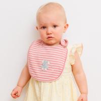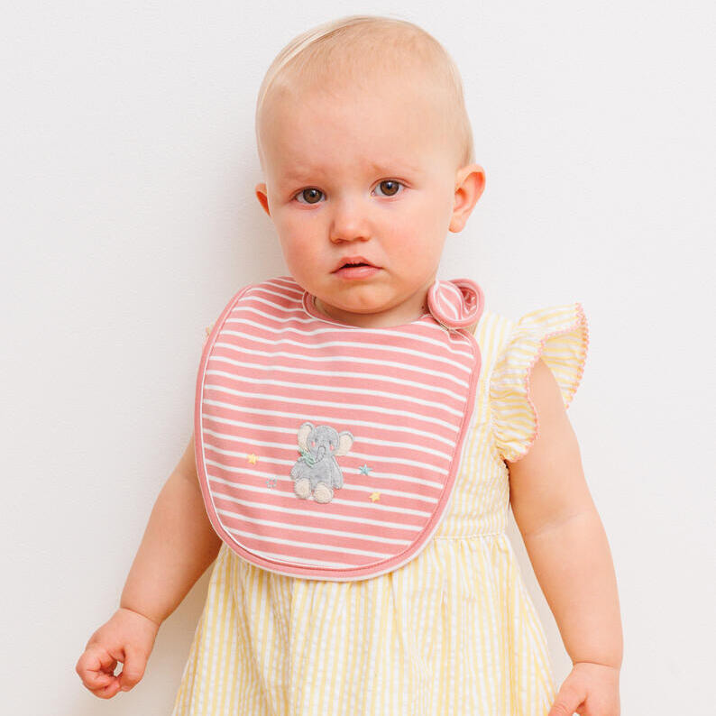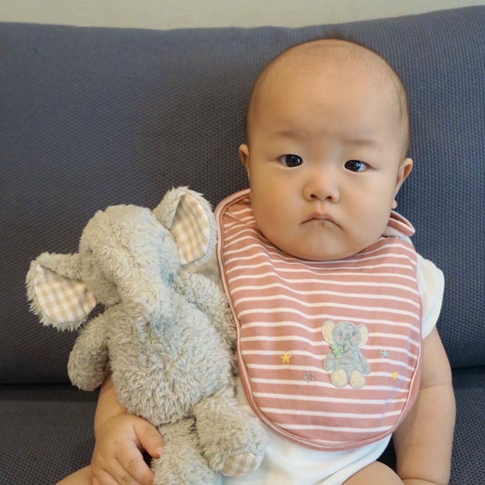 ぬいぐるみはふわふわの手触りで、赤ちゃんに優しく寄り添ってくれます。ゾウのアップリケが可愛いスタイは、ボタンひとつで着脱できる使い勝手の良いデザインです。
