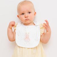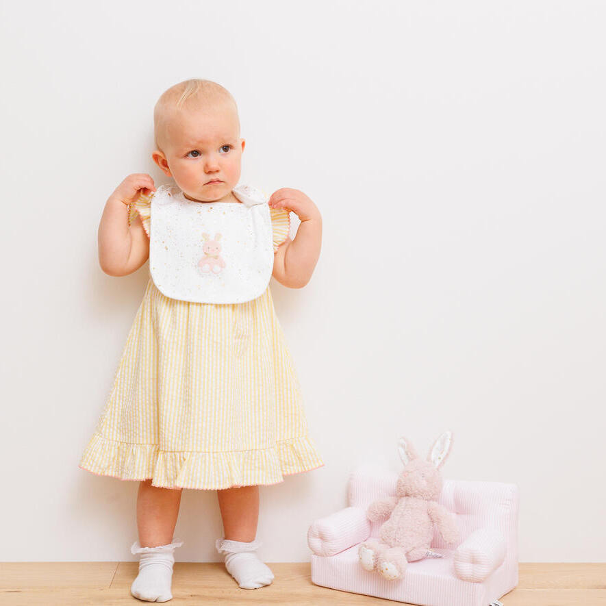 ぬいぐるみはふわふわの手触りで、赤ちゃんに優しく寄り添ってくれます。バニーのアップリケが可愛いスタイは、ボタンひとつで着脱できる使い勝手の良いデザインです。