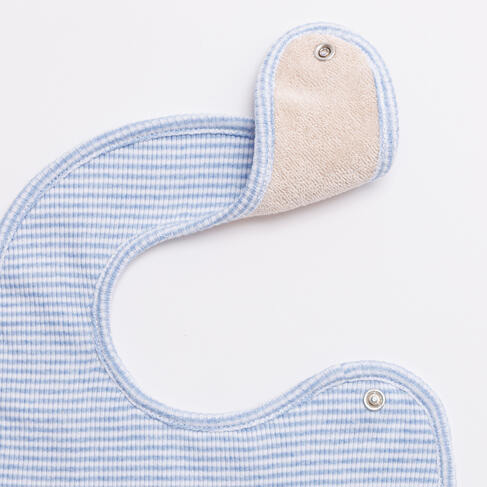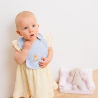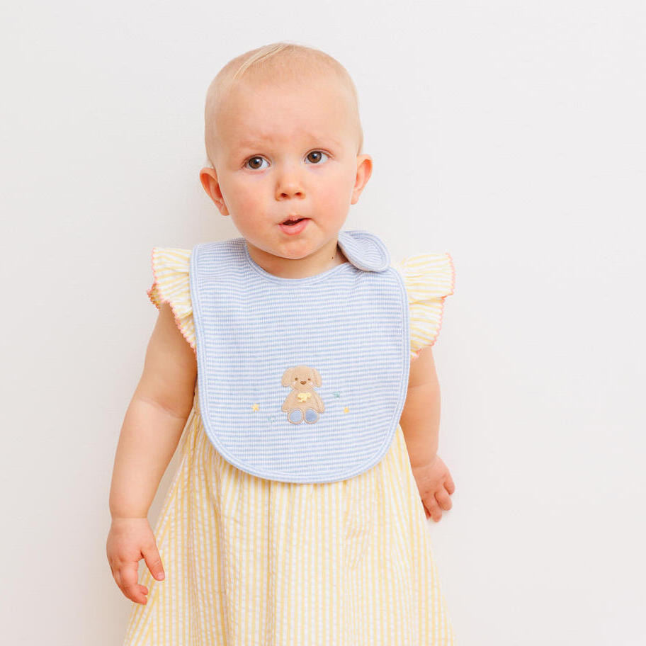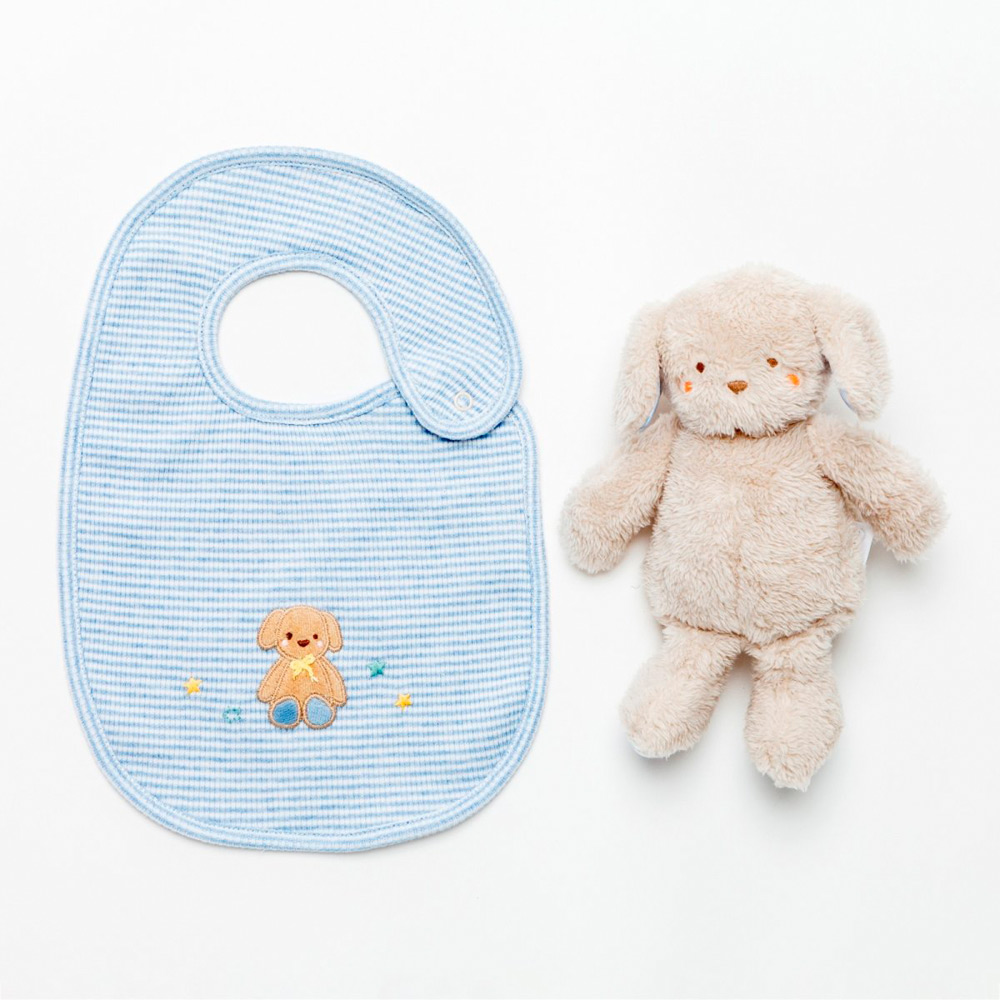 ぬいぐるみはふわふわの手触りで、赤ちゃんに優しく寄り添ってくれます。子犬のアップリケが可愛いスタイは、ボタンひとつで着脱できる使い勝手の良いデザインです。