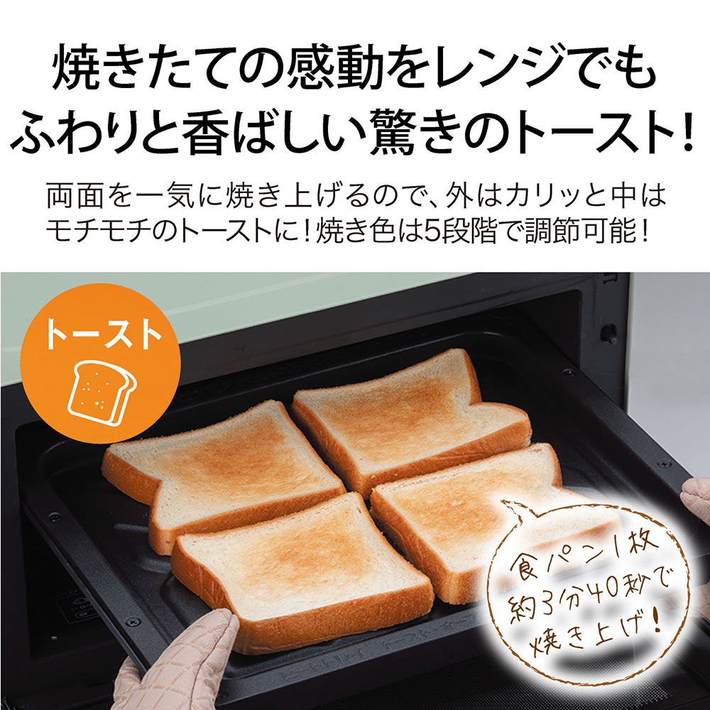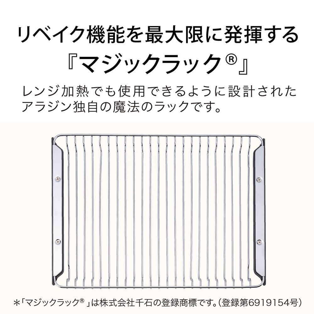 グラファイトヒータ×レンジ加熱で、トースターで焼いたようなこんがりトーストや、肉汁たっぷりのジューシーハンバーグ、できたてのようなお惣菜のリベイク、ムラを抑えた解凍も、簡単操作でかなえます。直感的に使えるダイヤル操作、文字がはっきり見やすい白黒反転液晶、毎日のトーストをお手軽にするアラジンならではのトーストキーなど使いやすい機能で、毎日のお料理をもっとおいしく、もっとラクに。