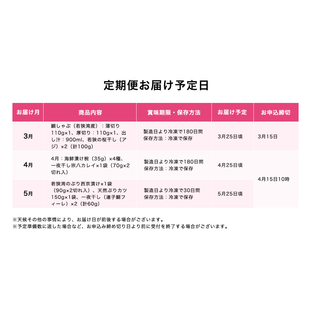 3月お届け:〈若狭の鯛しゃぶ食べ比べ〉 若狭湾産の真鯛を食感の異なる薄切りと厚切りの2種類でご用意。急速冷凍で鮮度を閉じ込めました。特製のあごだしスープにくぐらせれば、ふっくらとした身の甘みが引き立ちます。〆の雑炊まで、真鯛の旨味を余すことなくご堪能ください。〈若狭の桜干しアジ〉 若狭高浜に伝わる、伝統の干物。秘伝の醤油だれに漬け込み、魚の旨味とまろやかな甘みを凝縮させました。焼くだけで食卓を彩る贅沢な「ごちそう」が出来上がります。4月お届け:若狭湾産の真鯛、連子鯛、ふくいサーモン、国産いかを特製ダレに漬け込み、瞬間凍結で鮮度を封じ込めました。解凍してご飯にのせるだけで、ご家庭で本格的な漬け椀が楽しめます。「真鯛・連子鯛」練りごまでまろやかに仕上げた上品な味わい。「いか」:柚子胡椒がアクセントのピリ辛テイスト。「サーモン」:コチュジャンを効かせた、おつまみにも最適なユッケ風。〈一夜干し 宗八カレイ〉一晩かけてゆっくり熟成させることで、酸化を抑え、旨味をギュッと凝縮。身が厚く脂のりが良い宗八カレイは、柔らかな食感と独特の風味が特徴です。骨離れが良く、クセのない美味しさをご堪能ください。5月お届け:〈若狭天然ぶり西京漬け〉若狭湾産の新鮮な天然ぶりを厳選した西京味噌にじっくりと漬け込みました。2切れずつの真空パックで、焼くだけで手軽に旨味たっぷりの味わいをお楽しみいただけます。〈天然ぶりカツ〉刺身用の天然ぶりを贅沢にカツに仕上げました。最新の冷凍技術により鮮度抜群。少量の油で揚げるだけで、急な来客時にも重宝する豪華な一品が出来上がります。〈連子鯛一夜干し〉しっとりとクセのない味わいが魅力の連子鯛。食べやすいフィーレ状でお届けします。食卓を華やかに彩る鮮やかな色彩もあわせてお楽しみください。