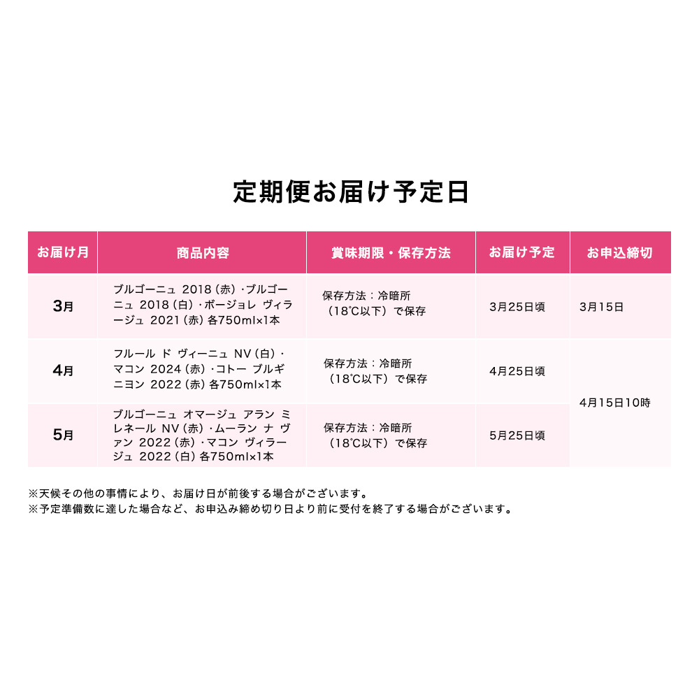 2026年3月→5月お届け(全3回):2026年2月25日(水)→3月15日(日)