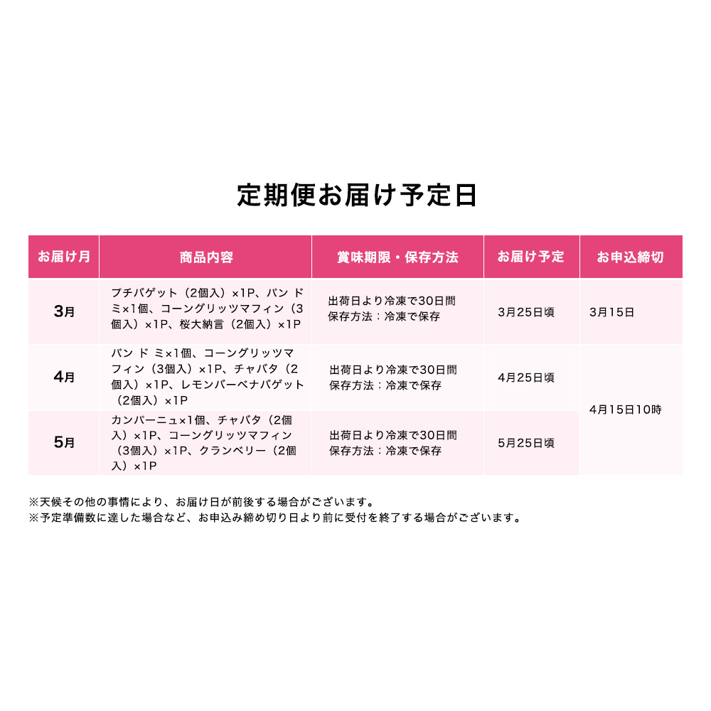 3月:プチバゲット(2個入)×1P、パン ド ミ×1個、コーングリッツマフィン(3個入)×1P、桜大納言(2個入)×1P