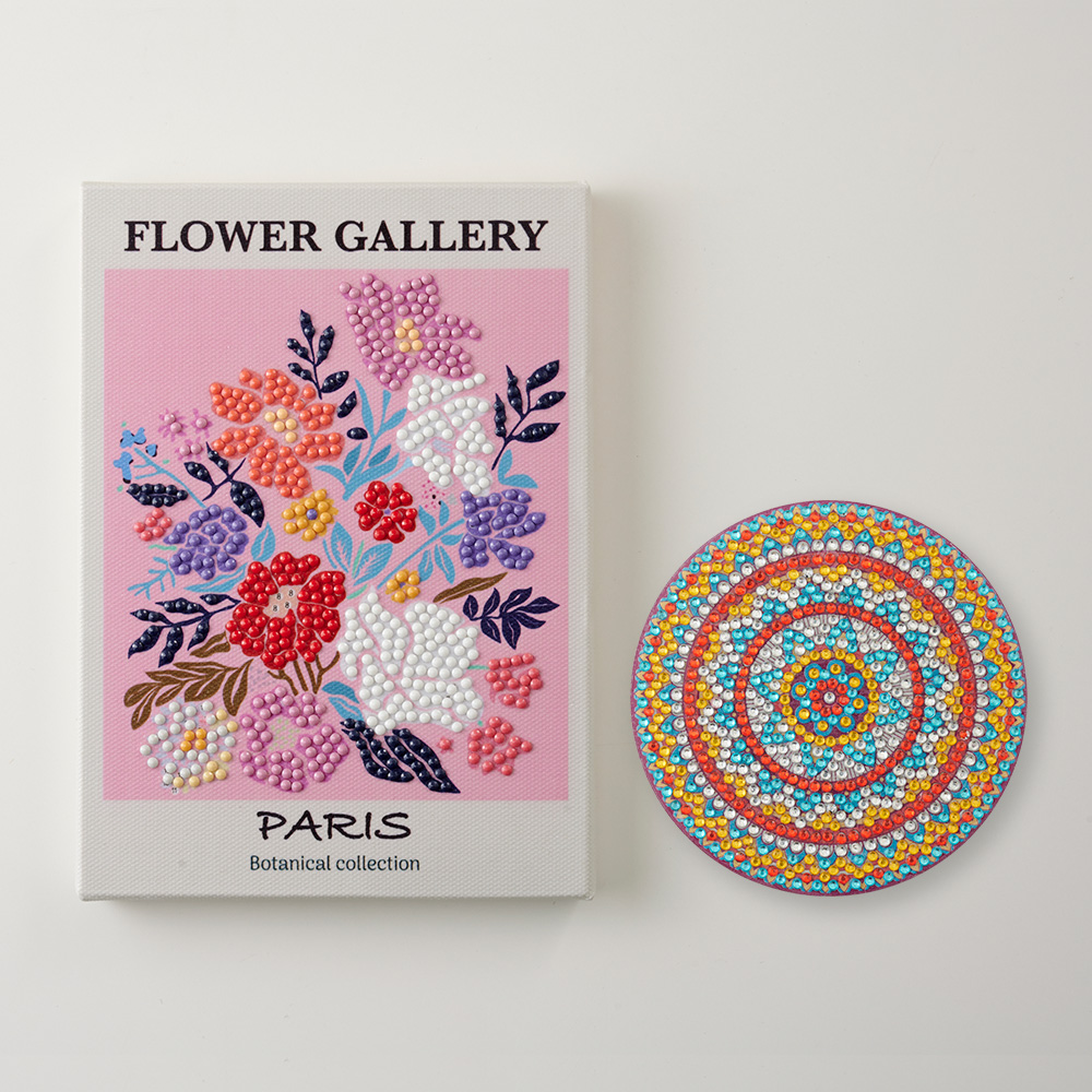 都市とお花を結び付けたデザインのボタニカル柄のアートパネルと、モザイク柄のコースターを1セットにして、毎月違う絵柄を3回にわたってお届けいたします。アートパネルは小さいサイズなので、ちょっとしたインテリアのアクセントにおすすめです。コースターは初心者の方でも気軽に作れるサイズ感で、裏にコルクシールを貼って仕上げます。 ダイヤモンドフィックスは、色とりどりのビーズを敷き詰めるように貼ることで、様々な絵を表現していきます。ビーズは優しく輝くようなカラーと質感なので、さりげない輝きに。木製枠のパネル状なので、作業がしやすく、できあがったらそのまま壁掛けや棚置きなどにして飾れます。必要な材料・道具をすべてセットしたキット販売ですので、初めての方でもすぐに始められます。没頭できる時間と仕上げる喜びを実感出来るハンドクラフトです。5月のお届け時に、ダイヤモンドフィックスの液体仕上げ材「ペインティングシーラー」を特別にプレゼントいたします。