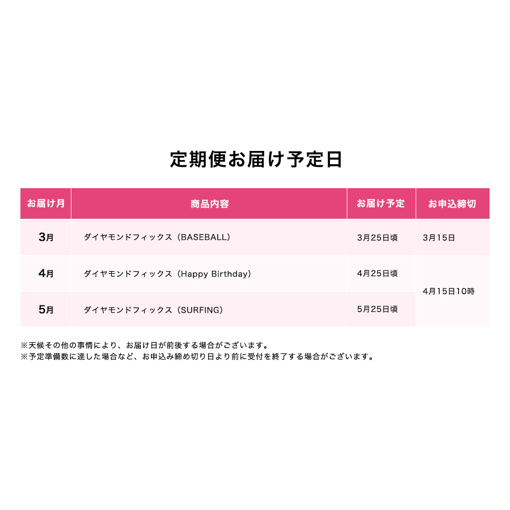 ※会期途中からのお申込みの場合は、翌お申込み締切日の商品からのお届けとなります。締切済みの月の商品のお届けはできかねますのであらかじめご了承くださいませ。