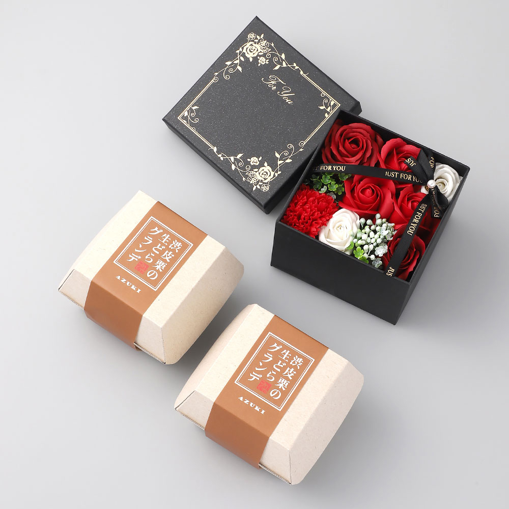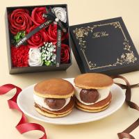 【冷凍便でお届けします。解凍まで時間がかかりますのでご注意ください。】ほのかに石鹸のアロマを楽しめる観賞用ソープフラワーと貴重な国産栗を五感全てで楽しめる生どらを詰合せました。ソープフラワーは本物のお花と見間違えるほどの出来ですが石鹸でできたお花のためお手入れ不要で華やかさも長持ちします。生どらはどら焼きの生地で、二日間かけて炊きあげた特製つぶ餡、ラム酒を絶妙に効かせたマロンクリーム、主役の渋皮栗を二段に重ねてサンドしました。
