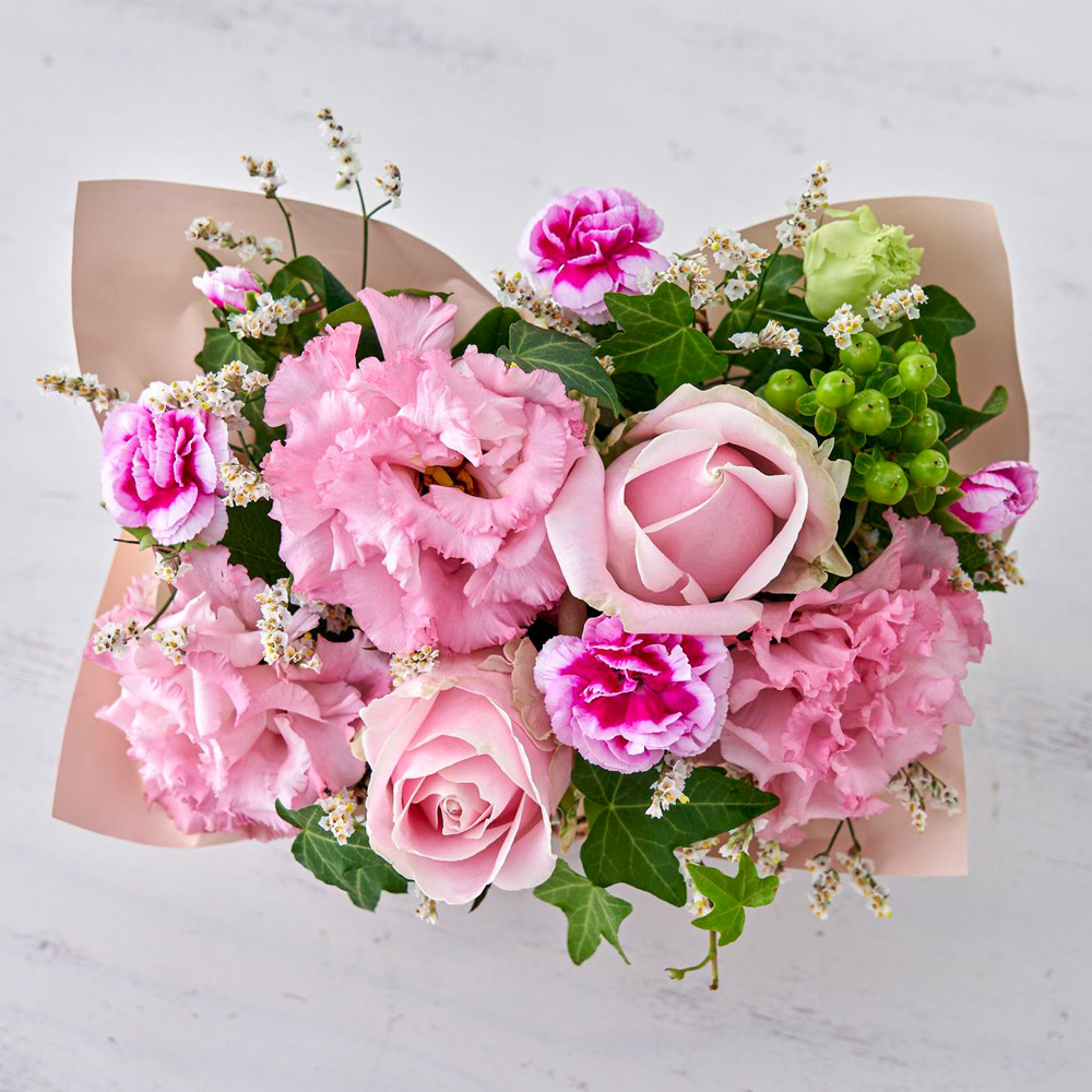 生花:バラ、リシアンサス、スターチス、スプレーカーネーション、ヒペリカム、グリーン
