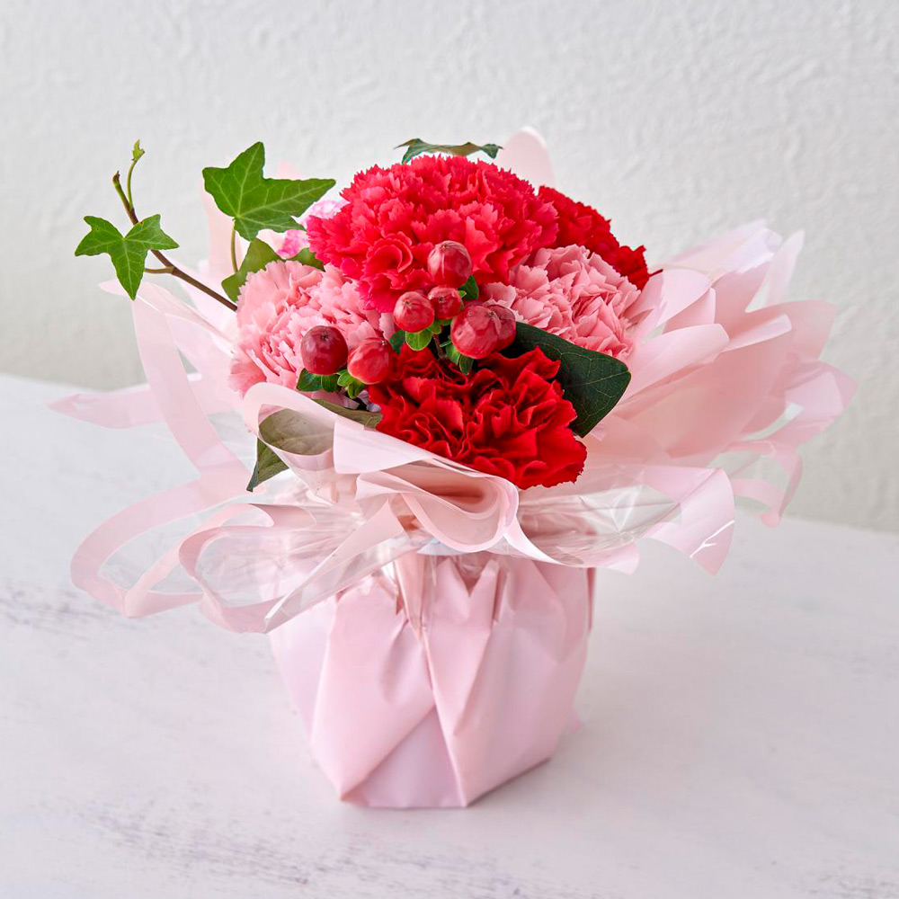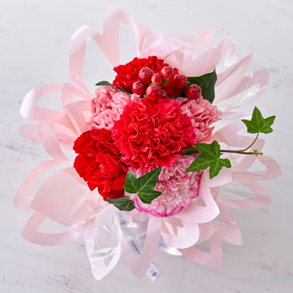 生花:カーネーション、ヒペリカム、グリーン