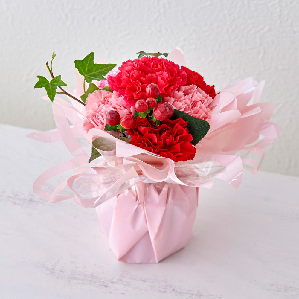 生花:カーネーション、ヒペリカム、グリーン
