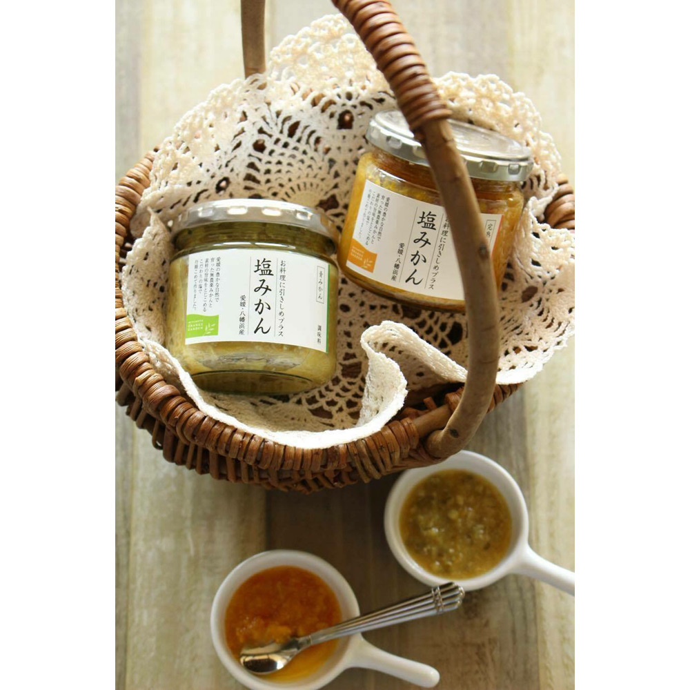 愛媛の新しい調味料「塩みかん」のギフトセット。「塩みかん」とは、「みかんを塩漬けにして熟成させた調味料」。愛媛の新しい調味料「塩みかん」を、ドレッシングに仕上げて手軽に使いやすくしました。