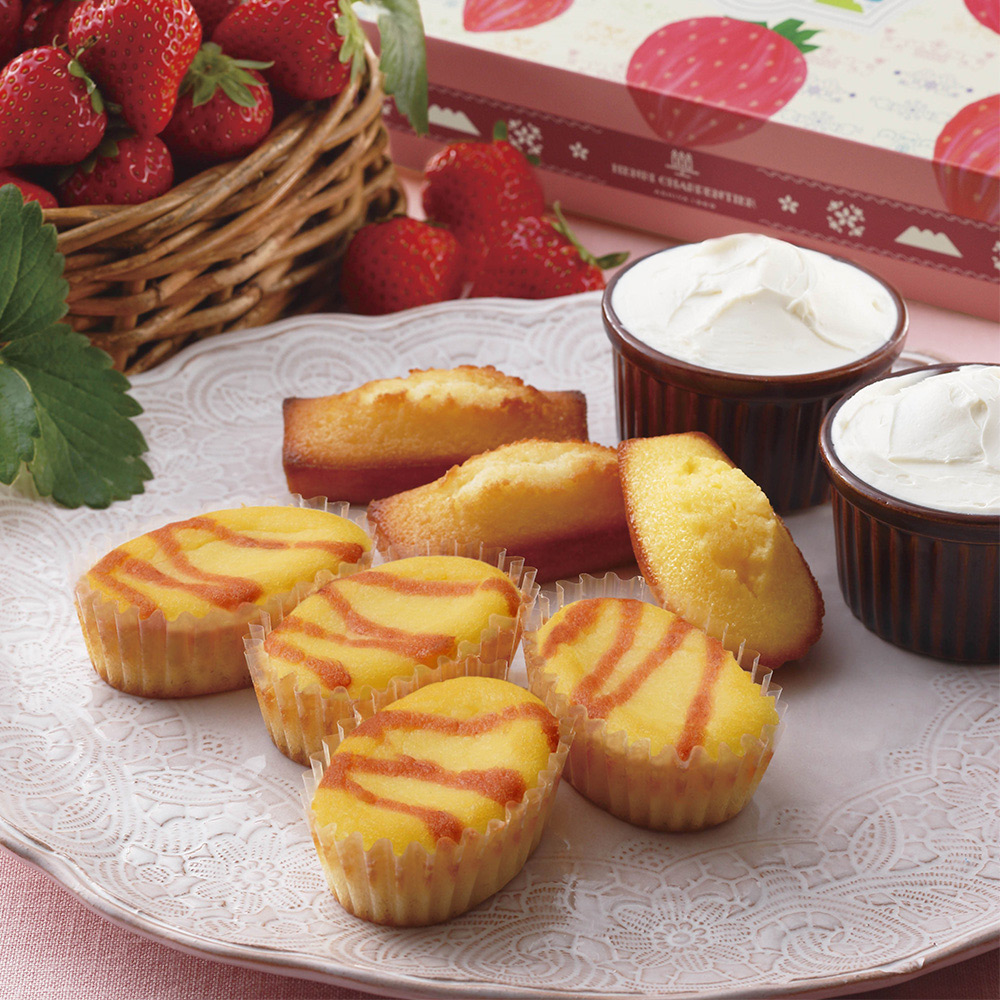 <ケーク・フロマージュ<フレーズ>>しっとり焼き上げたクリームチーズのまろやかな乳味と、宮城県のいちごの甘酸っぱい香りが楽しめるチーズケーキです。宮城県産いちごは旬のやさしい甘さが広がる個性豊かな複数のブランド苺を使用しました。<フィナンシェ>しっとりやさしい口どけとともに、香り高いアーモンドの風味と発酵バターの豊かなコクがふわっと広がります。アンリ・シャルパンティエの自信作です。<マドレーヌ>ふっくらしっとりした食感にラム酒のまろやかな香り、レモンと蜂蜜の爽やかな酸味が深いコクをもたらします。