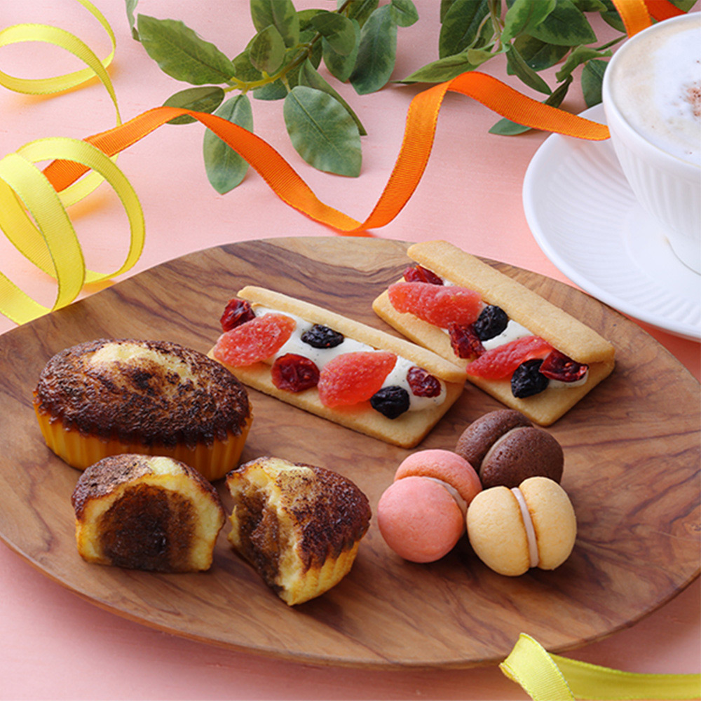 <焼きティラミス>こだわりの北海道産マスカルポーネと北海道産小麦を使用したスポンジに、ほろ苦いコーヒーシロップを一つ一つていねいに染み込ませました。<ベリーウィッチ>ストロベリー、クランベリー、ブルーベリーのドライフルーツをバニラペーストとホワイトチョコを使用したクリームにトッピング。サクサク食感のバターサブレとの相性は抜群です。<サクッチ・ホロッチ>(ミルク)濃縮ミルクとホワイトチョコレートのパウダーを加えた贅沢なクッキー生地と、ミルク感が濃厚なベルギー産のホワイトチョコレートをサンドしました。(いちご)いちごの風味を加えたサクッと軽い生地と、ほんのり甘酸っぱいいちごチョコレートをサンドしました。(チョコレート)薫り高いチョコレート生地にほろ苦いベルギー産クーベルチュールチョコレートをサンドしました。