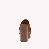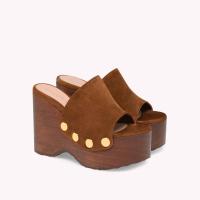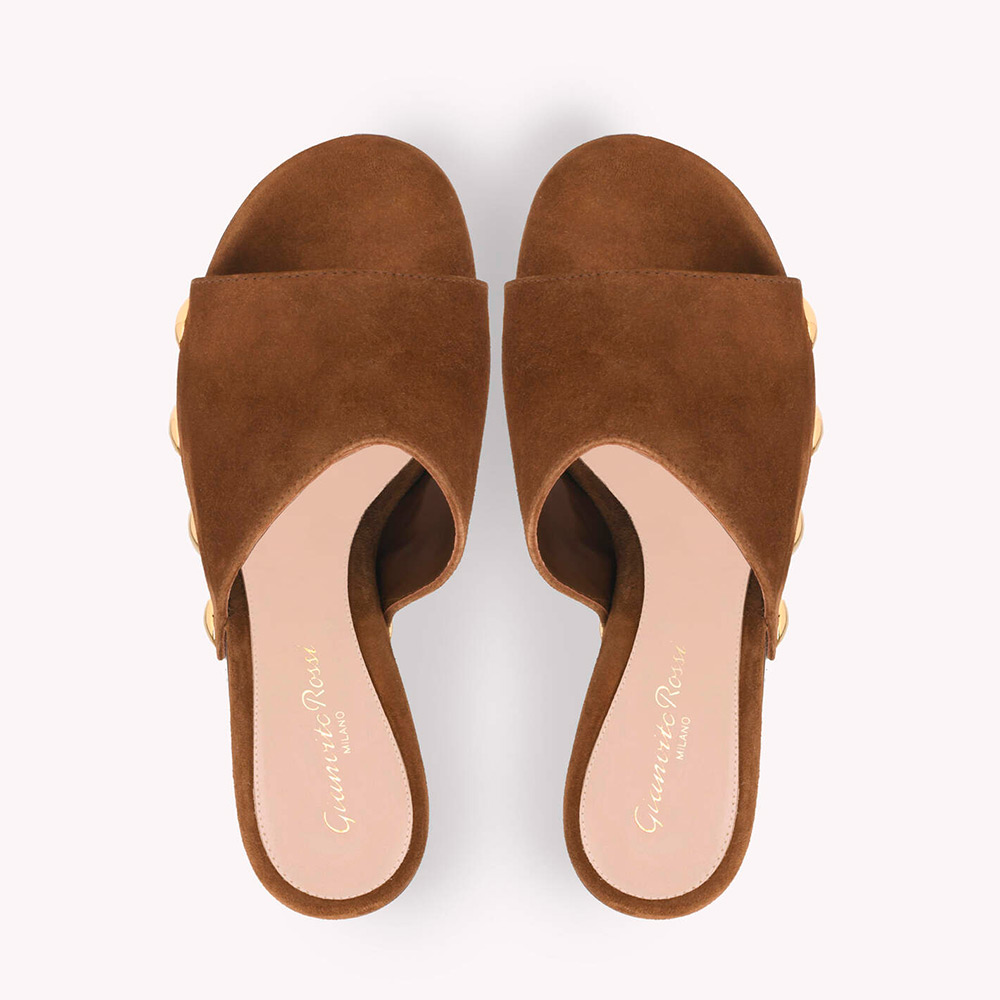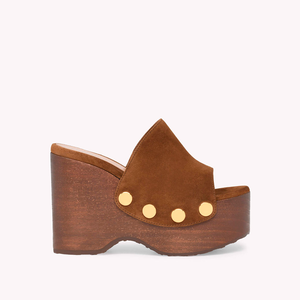 しなやかなスエード地から丹念に作り上げたラウンドトゥのクロッグシューズ、Ardea。大きなメタルスタッズの装飾が存在感を放ちます。ラバーソールを備えた木製ウェッジの厚さは、前側が約46mm、後ろ側が約110mm。手作業によって仕上げました。