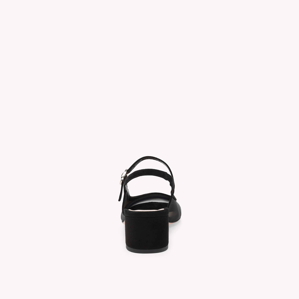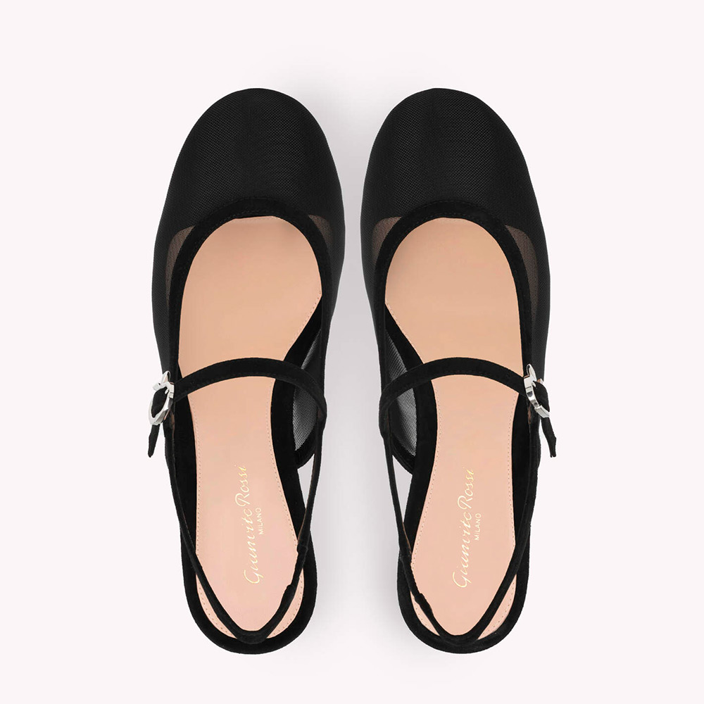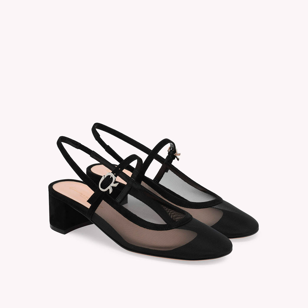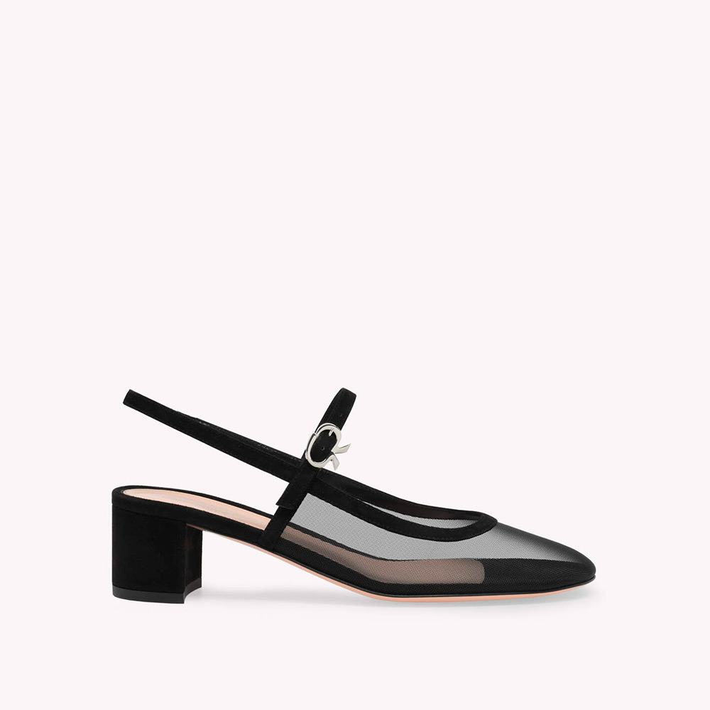 シースルーのメッシュ素材としなやかなスエード地から丹念に作り上げたメリージェーンスタイルのスリングバックパンプス、Francoise。高さ45mmのブロックヒールを備えた、ラウンドトゥのモデルです。フロントストラップには、シグネチャーのリボンバックルがあしらわれています。レザーで覆われたバックストラップの内側には伸縮性素材を使用しているため、足にぴったりとフィットします。手作業によって仕上げました。
