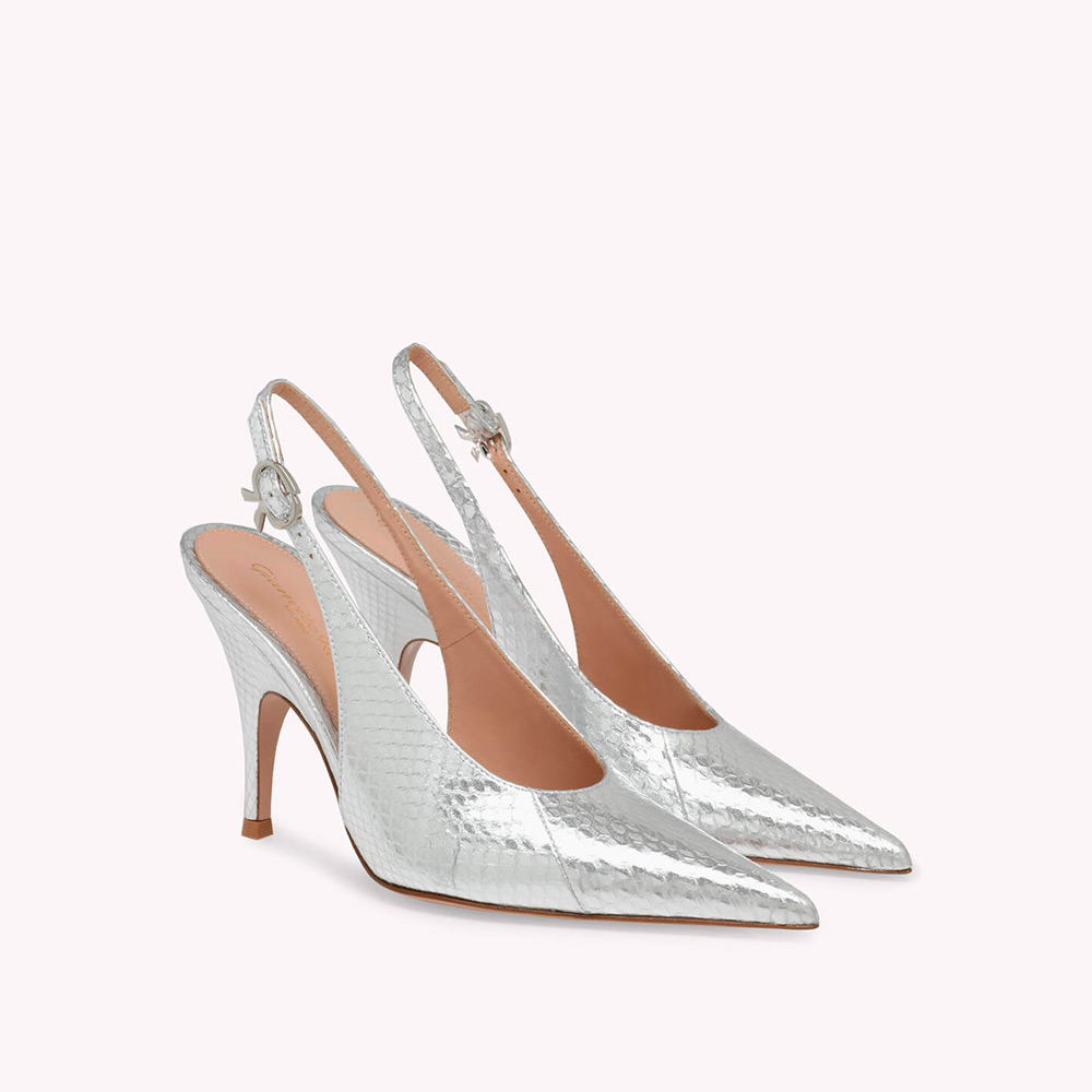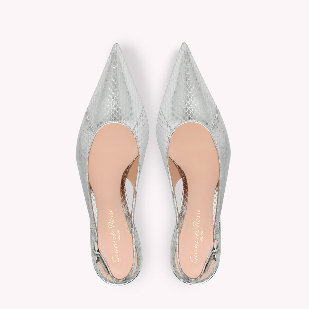 メタリックレザーから丹念に作り上げたスリングバックパンプス、Sofia Sling。高さ95mmのヒールと水ヘビをイメージしたデザインが特徴です。ハンドメイドで仕上げました。