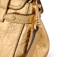 染色を行った柔らかなカーフレザーに、熱圧着でメタリック箔をあしらった素材。この箔はあらかじめタンブル加工を施すことで、しわのある独特の風合いを出しています。