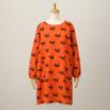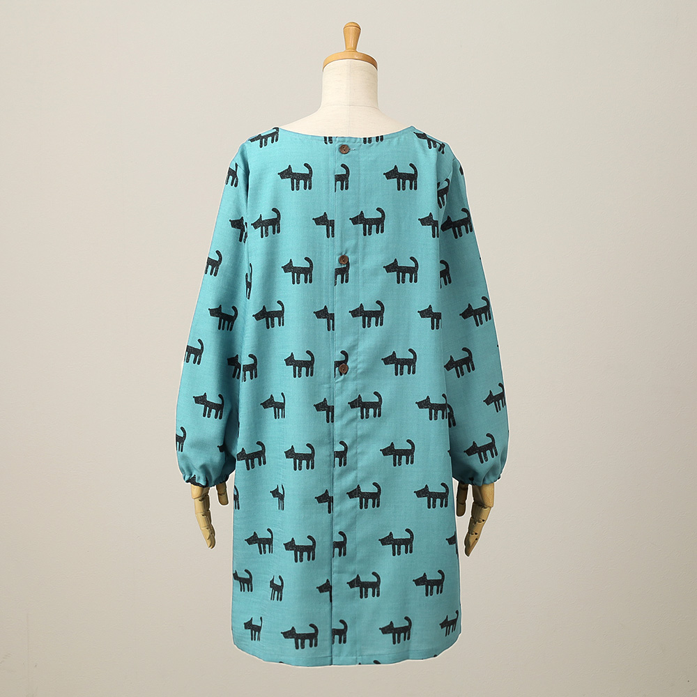 ドライタッチのポリエステル生地に整列されたかすれ表現の犬のプリントが特徴的な割烹着。身体のラインを拾わず、ゆったりとしたシルエットでシワになりにくいのもポイントです。