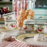 フレンチ ガーデンは、伝統的なカントリー ハウスの庭の風景が温かみのある色調で描かれています。さまざまな果物や草花が美しく描かれ、時代を超えて愛されるパターンです。