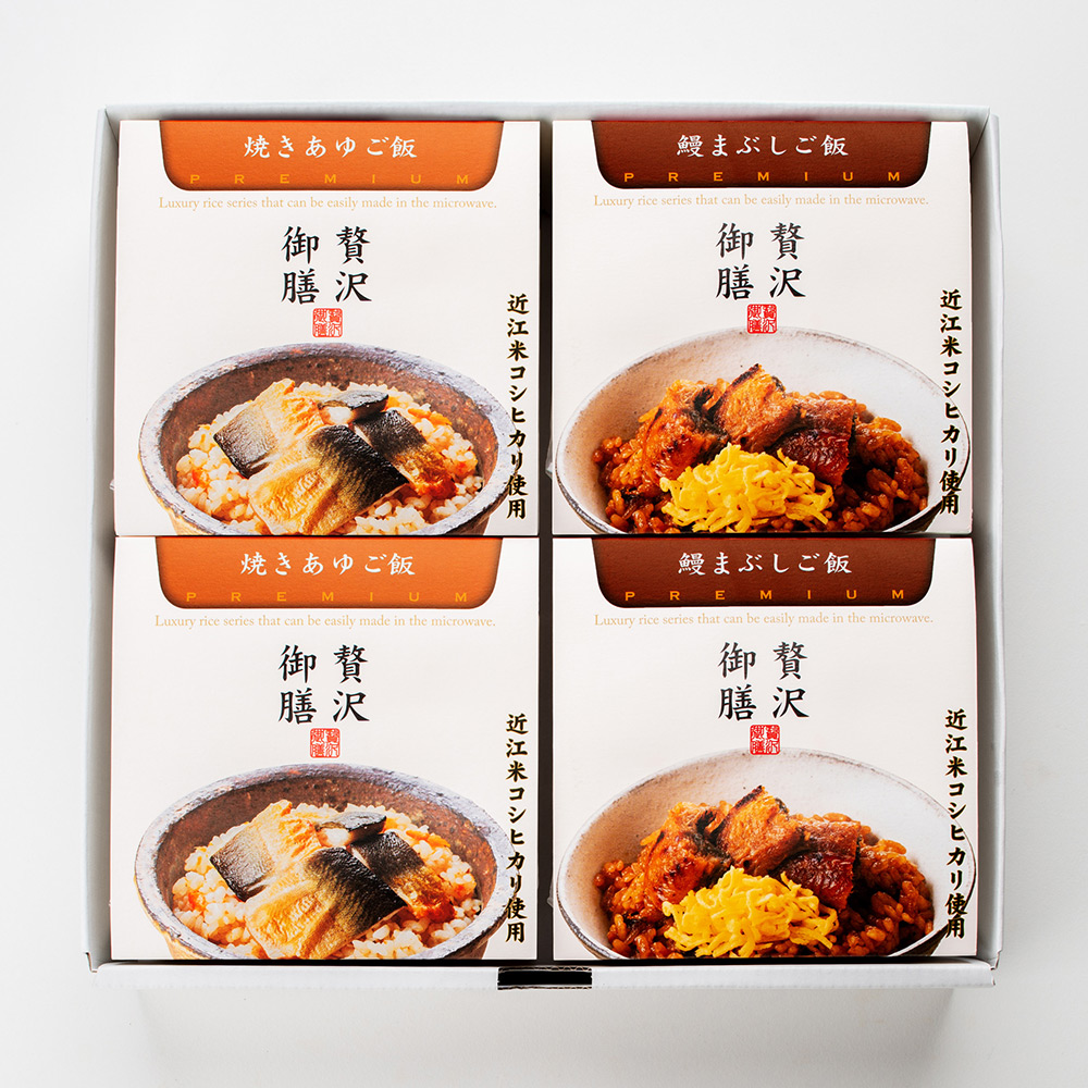 琵琶湖湖畔・彦根に軒を構える老舗が作った、手軽にお召し上がりいただける贅沢御膳。国産鰻と滋賀県産の鮎、滋賀県産コシヒカリを使い、老舗の技で丁寧に仕上げています。電子レンジで温めるだけ、手間いらず・食べきりサイズの本格的な一膳です。【鰻まぶしご飯】炭火焼きした国産鰻の香ばしい味わいです。【焼きあゆご飯】「香魚」鮎の風味を味わう涼やかな一膳です。