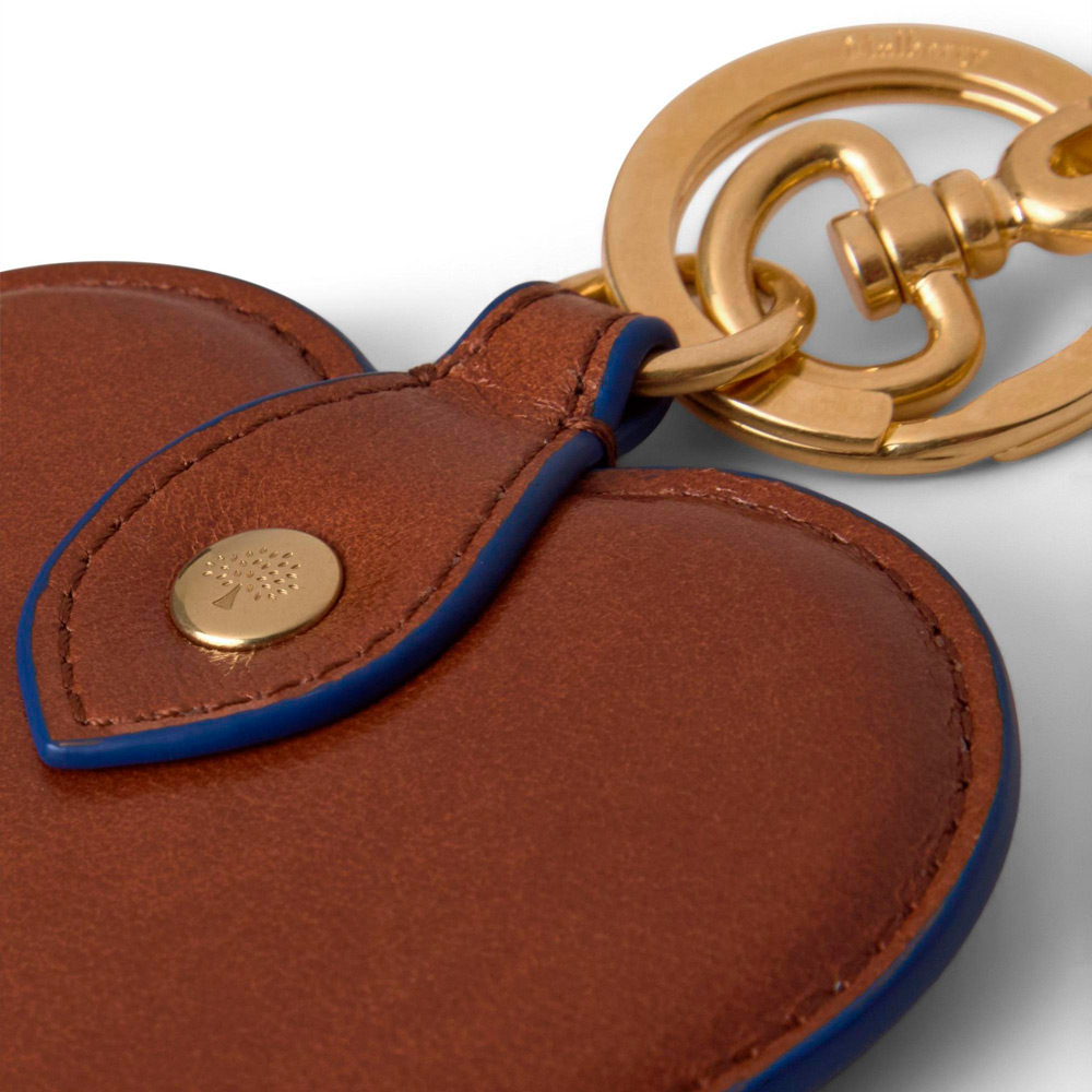 マルベリーツリーのリベットをあしらったハート型のレザーキーリング。ダブルリングとスナップフックの留め具付き。大切な方に想いを伝えるのにぴったりのアイテムです。その愛らしいフォルムで、心を射止めて。