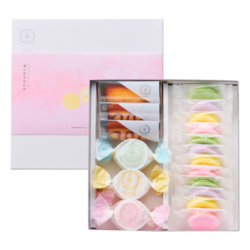 春らしい彩りのふやきにクリームをサンドした「彩ふわり」、お口に入れるとほろほろと溶ける「春のクッキー(ポルボロン)」、しっとりとやさしい口当たりの「春のフィナンシェ」の詰め合わせ。
