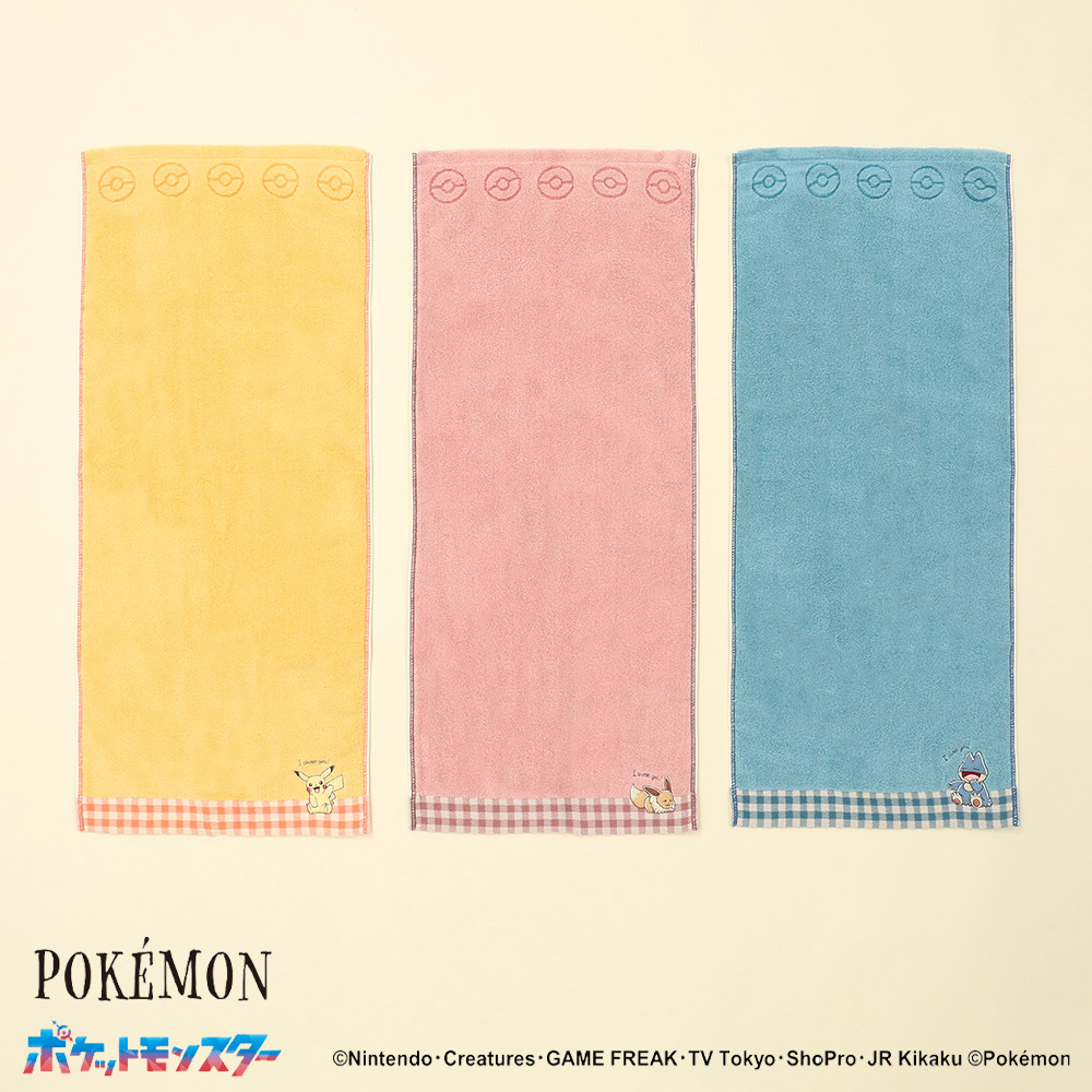 シンプルな無地カラーにピカチュウ、イーブイ、ゴンべのアップリケ刺しゅうが可愛いポイント。それぞれのポケモンをイメージしたカラーリングに、ギンガムチェック柄がキュートさを更に引き立てています。ふわふわした無撚糸で触りごごちの良くボリュームがあり、ご自分用はもちろん、ご友人へのプレゼントなどにもおすすめです。