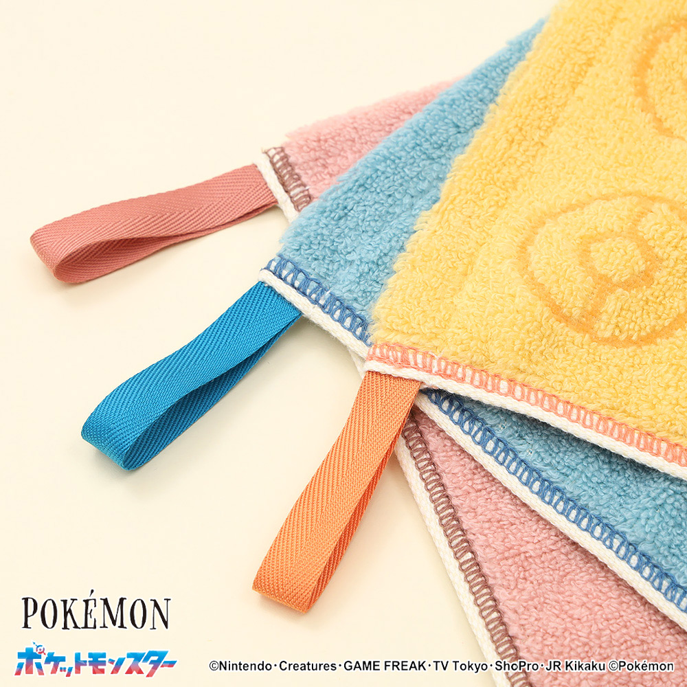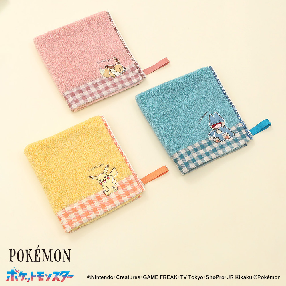 シンプルな無地カラーにピカチュウ、イーブイ、ゴンべのアップリケ刺しゅうが可愛いポイント。それぞれのポケモンをイメージしたカラーリングに、ギンガムチェック柄がキュートさを更に引き立てています。こちらはループ付きのためフックなどに掛けてお使いいただけるのも嬉しいポイント。ふわふわした無撚糸で触りごごちの良くボリュームがあり、ご自分用はもちろん、ご友人へのプレゼントなどにもおすすめです。