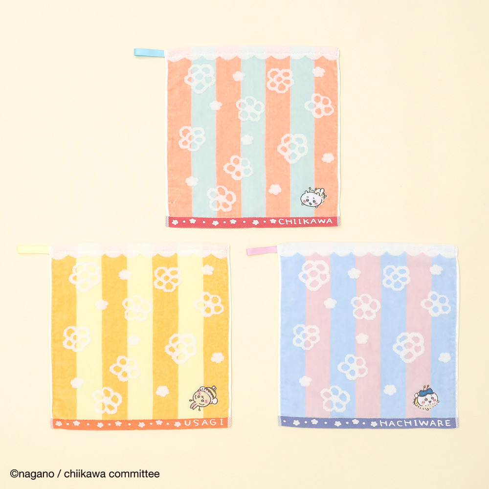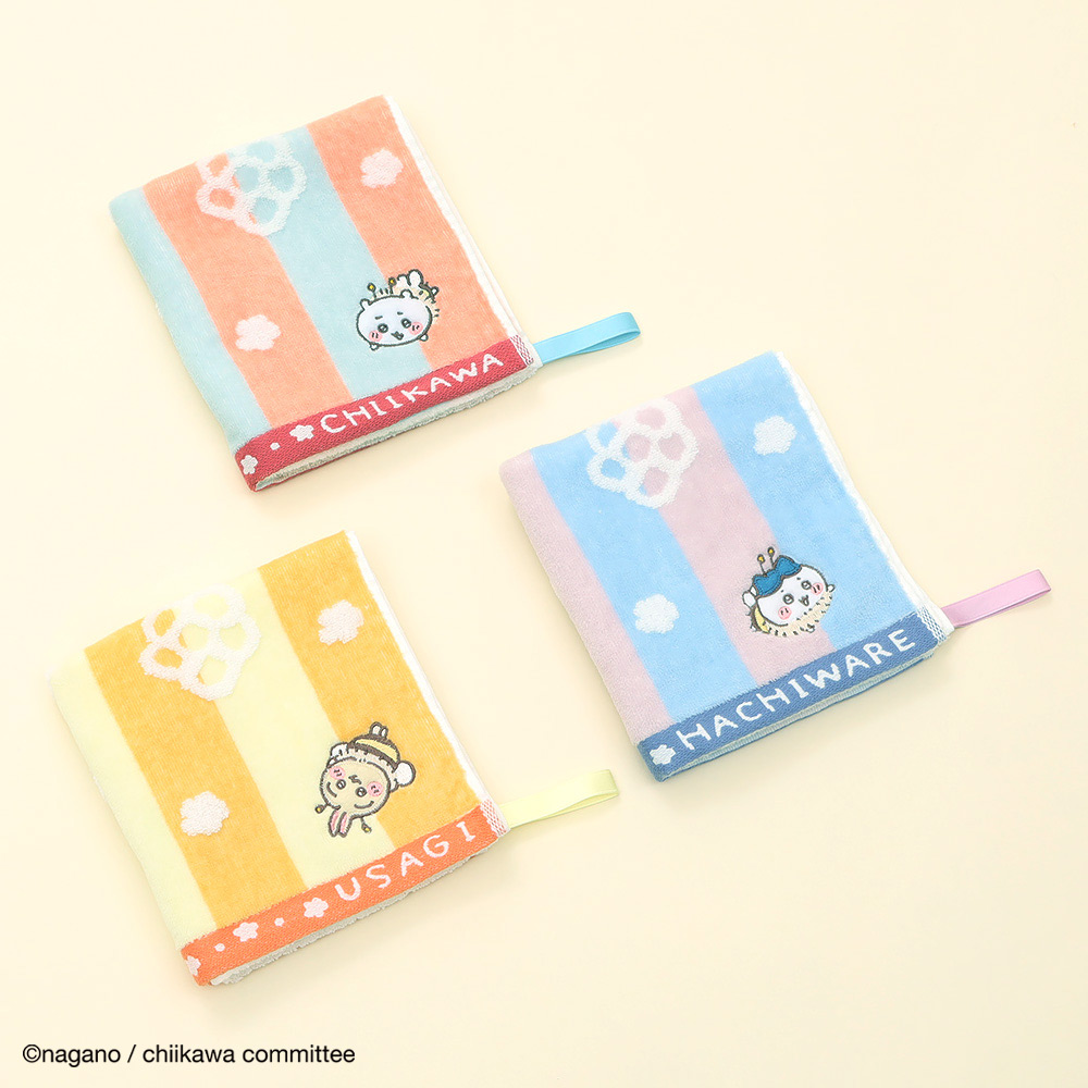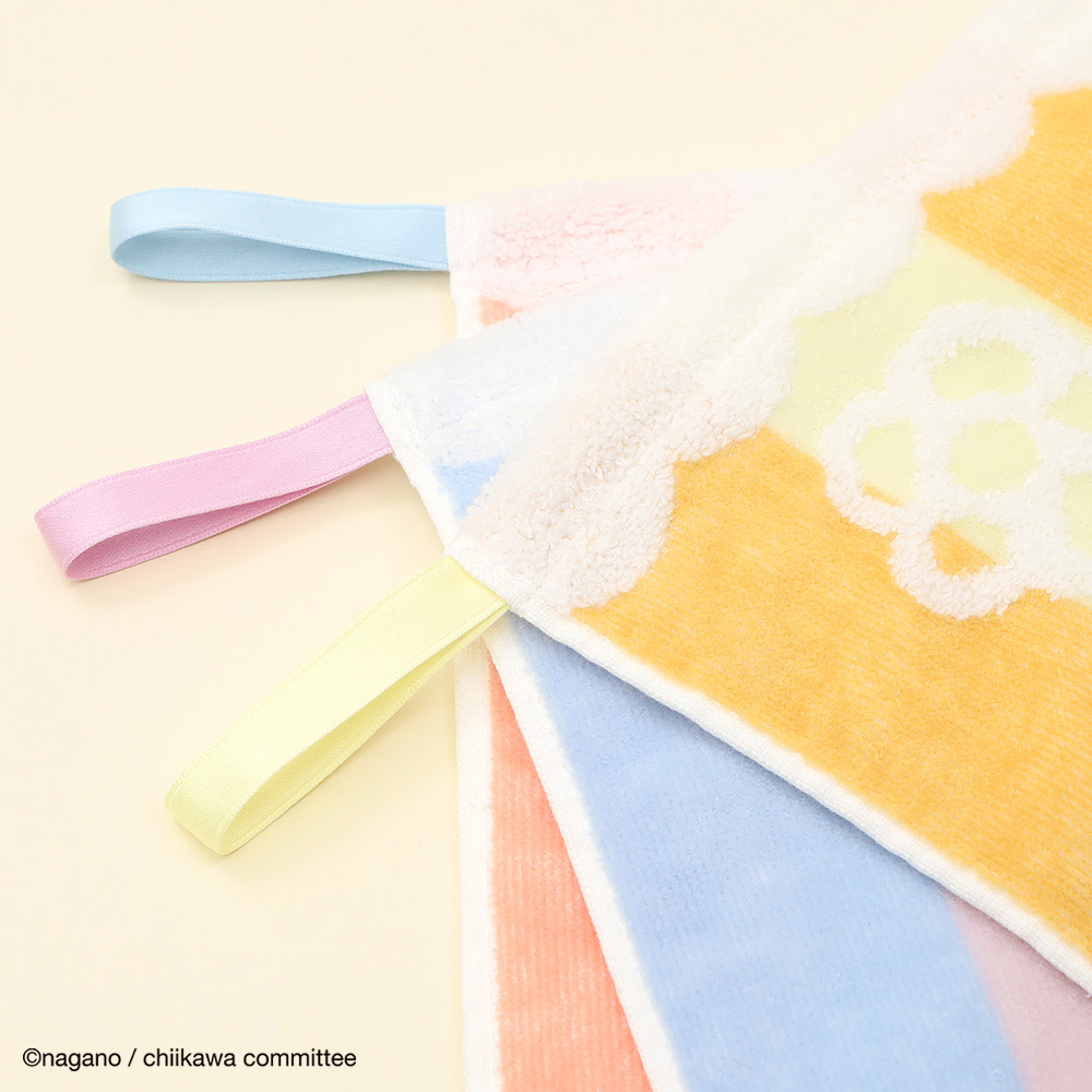 ちいかわ・ハチワレ・うさぎがミツバチになって、楽しそうに飛んでいます。ポップなカラーリングにお花が舞っていて、使うたびに明るい気分にさせてくれます。こちらはループ付きのためフックなどに掛けてお使いいただけるのも嬉しいポイント。ふわふわした無撚糸で触りごこちが良くボリュームもあり、自分用はもちろん、ご友人へのプレゼントなどにもおすすめです。