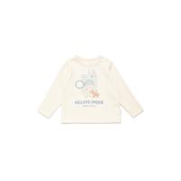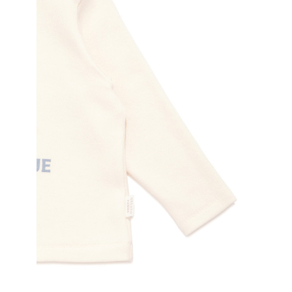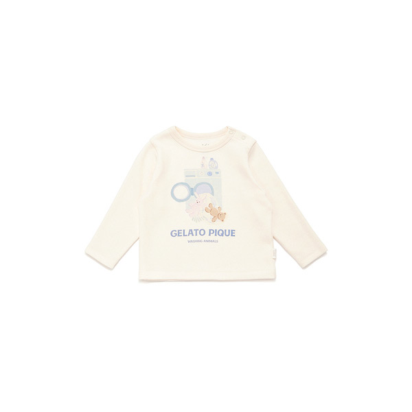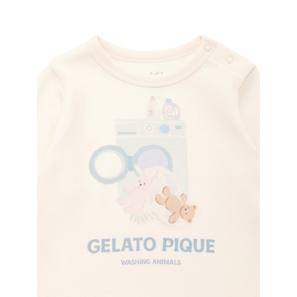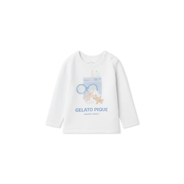 [Fabric]適度な厚みと柔らかさのあるエイトロックのカットソ-素材を使用しました。[Design/Styling]シャボンの香りが漂ってきそうな、春のピースフルなお洗濯タイム。ウォッシングアニマルシリーズです。洗濯機から溢れるもこもこのぬいぐるみたちをプリントしたBABYサイズのロングTシャツ。寒さが続く今の時期にちょうど良い、ふんわりとした肌触りのエイトロック素材を使用しました。肩にスナップボタン付きで、1枚での着用はもちろんポンチョ等のインナーとしても重宝します。色は春らしい爽やかな色合いのオフホワイトとブルーを揃えました。同シリーズの総柄パンツやジャガードニット、雑貨と合わせてギフトにしたり、KIDSサイズとのリンク・コーディネートもお楽しみいただけます。