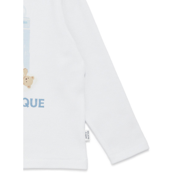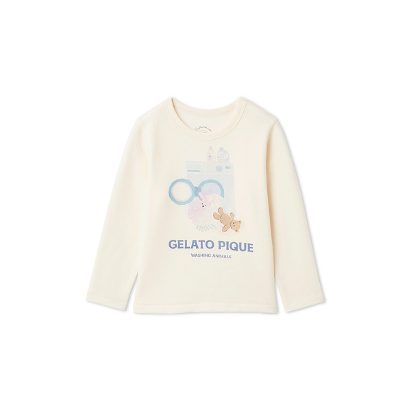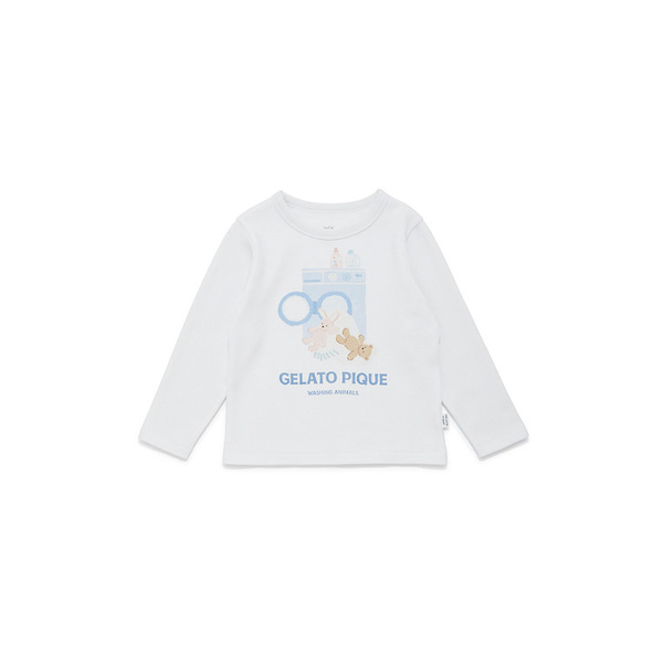 [Fabric]適度な厚みと柔らかさのあるエイトロックのニット素材を使用しました。[Design/Styling]シャボンの香りが漂ってきそうな、春のピースフルなお洗濯タイム。ウォッシングアニマルシリーズです。洗濯機から溢れるもこもこのぬいぐるみたちをプリントしたKIDSサイズのロングTシャツ。寒さが続く今の時期にちょうど良い、ふんわりとした肌触りのエイトロック素材を使用しました。ベーシックなシルエットでパーカやカーディガン等のインナーとしても重宝します。色は春らしい爽やかな色合いのオフホワイトとブルーをご用意。同シリーズの総柄パンツやジャガードニット、雑貨と合わせたり、BABYサイズとのリンク・コーディネートもおすすめです。