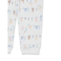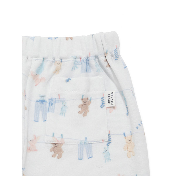 [Fabric]適度な厚みと柔らかさのあるエイトロックのカットソ-素材を使用しました。[Design/Styling]シャボンの香りが漂ってきそうな、春のピースフルなお洗濯タイム。ウォッシングアニマルシリーズです。洗濯紐に留まったルームウェアやぬいぐるみたちの絵柄を、総柄プリントしたKIDSサイズのロングパンツ。ぐるりと入った絵柄の中には、ロープをよじのぼろうとする愛らしいベアも混ざっています。寒さが続く今の時期にちょうど良い、ふんわりとした肌触りのエイトロック素材を使用。右ヒップにポケットを付けた動きやすいシルエットです。色は春らしい爽やかな色合いのオフホワイトとブルーを揃えました。同シリーズのワンポイントロンTやジャガードニット、雑貨と合わせたり、BABYサイズとのリンク・コーディネートもお楽しみいただけます。