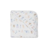 [Fabric]適度な厚みと柔らかさのあるエイトロックのニット素材を使用しました。[Design/Styling]シャボンの香りが漂ってきそうな、春のピースフルなお洗濯タイム。ウォッシングアニマルのルームウェアに合わせてお楽しみいただける、BABY雑貨シリーズです。洗濯紐に留まったルームウェアやぬいぐるみたちの絵柄を、総柄プリントしたBABYサイズのブランケット。ぐるりと入った絵柄の中には、ロープをよじのぼろうとする愛らしいベアも混ざっています。ふんわりとした肌触りのエイトロック素材で、フードが付いているのでお昼寝やお出かけの際のおくるみとしても使用可能。ワンポイントでブランドロゴも添えました。色は春らしい爽やかな色合いのオフホワイトとブルーの2色展開。同シリーズのルームウェアや雑貨と合わせたり、ギフトにもおすすめです。