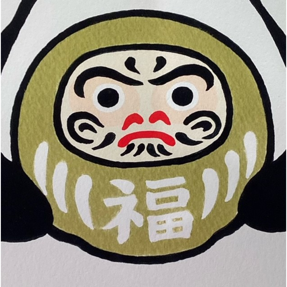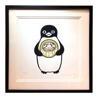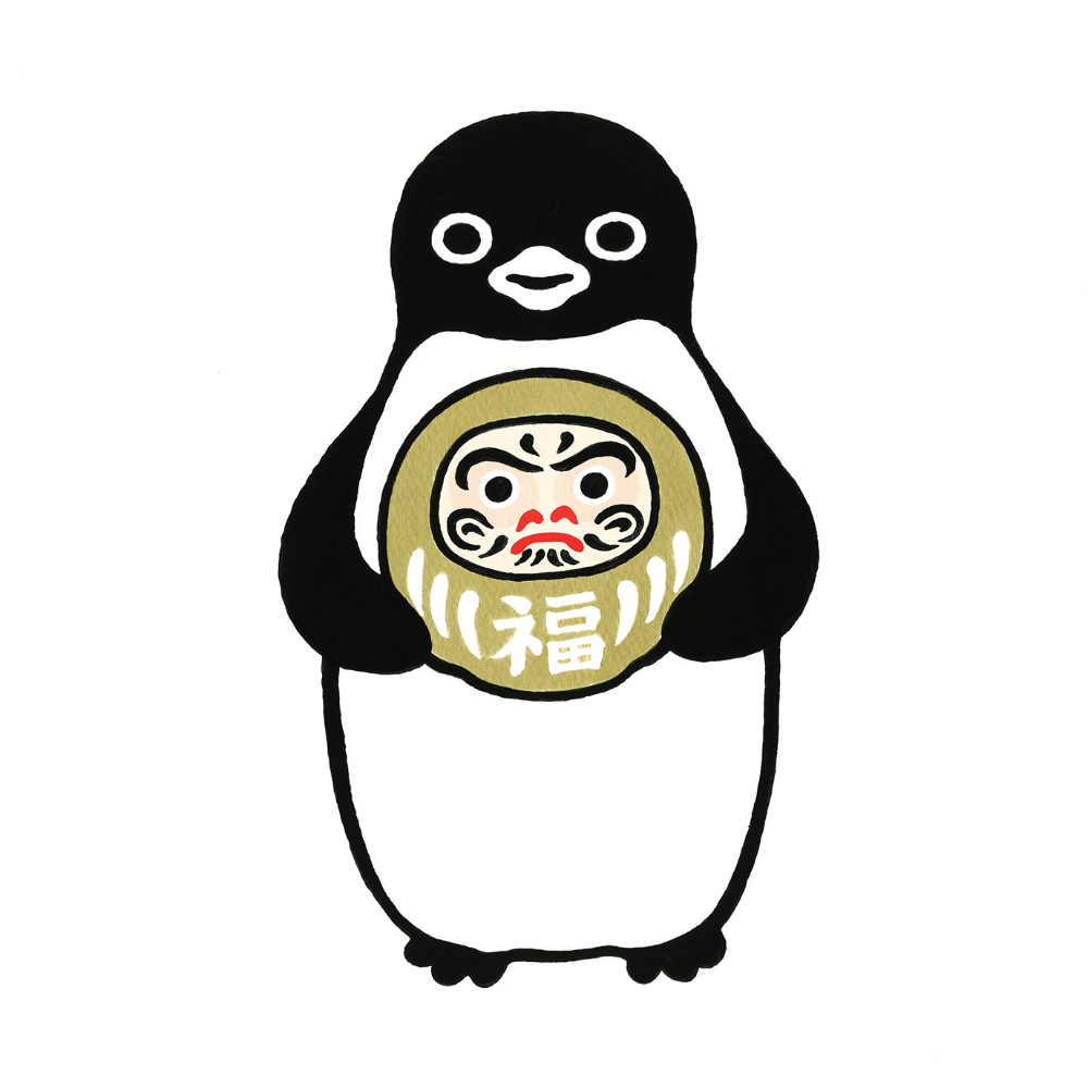 縁起物のだるまを抱えて満足そうなペンギンさん。「福」や「願い」を象徴するダルマを大切そうに抱える姿は、見ているだけで心が温まります。
