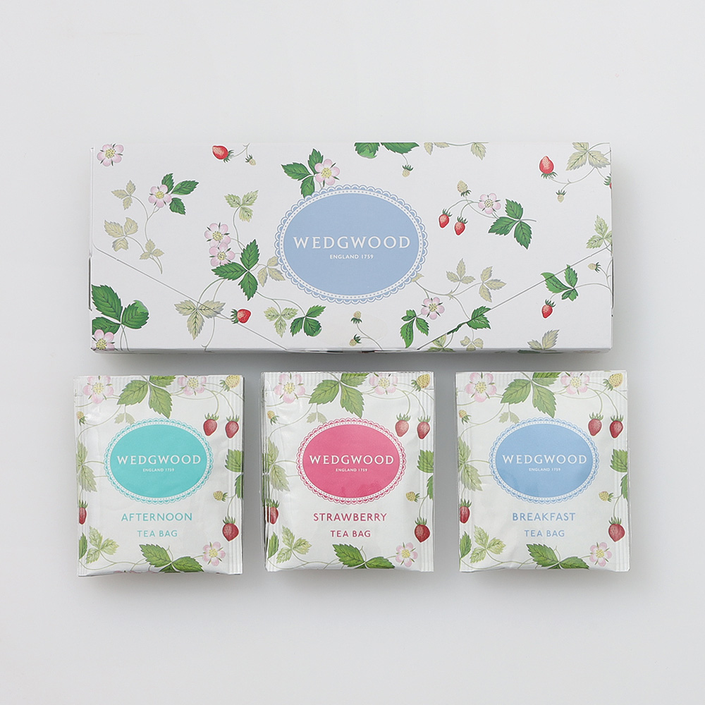 ウェッジウッドの人気パターン、ワイルドストロベリーをあしらったパッケージに3種類の紅茶を詰め合わせました。お配り用に最適な5個セットでお届けします。