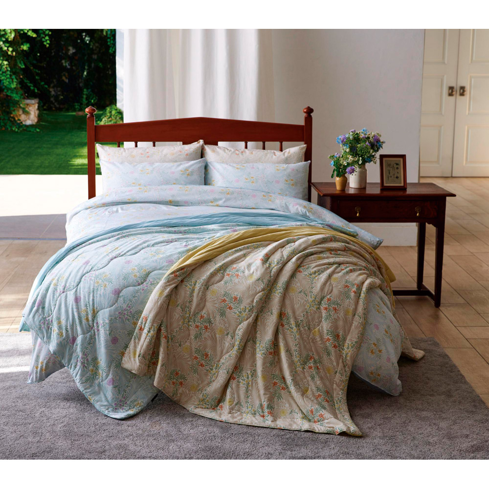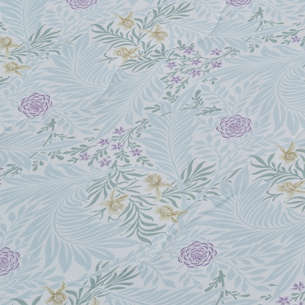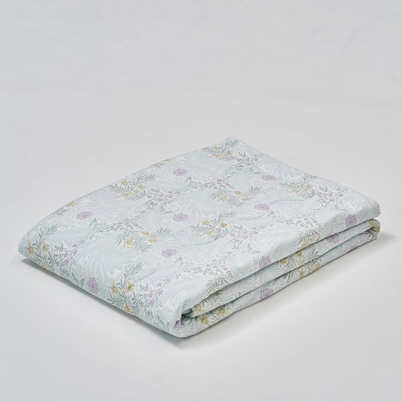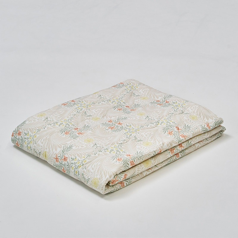モリスの代表作、ラークスパー柄をあしらったキルトケットです。らせん状の葉と繊細な花々が織りなす優美なデザインで、まるで光と風をまとうような、うっとりする心地よさ。なめらかなレーヨン混生地が、とろけるような風合いを実現しました。一年中快適に使える、洗えるキルトケットです。