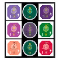 覆いをして特有の香りと旨味をひきだした玉露の「二藍」、「古代紫」、「楝」、渋味と旨味が調和したかぶせ茶の「菖蒲」、爽やかな香りが楽しめる煎茶の「常盤」、「老竹」、「松葉」、香ばしい香りでやわらかい味わいの「ほうじ茶鳶」、「ほうじ茶栗梅」の計9種類の詰め合わせです。気分に合わせてお楽しみください。