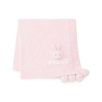 [Fabric]POWDER(パウダー):ケーキの仕上げにふんわり振るうパウダーのように、さらふわの肌触りが特徴です。ムレにくくパウダリーなタッチが続きます。目の細かい短毛ニットならではの、程良い弾力感が身体を包み込みます。[Design/Styling]子どもたちへのギフトにおすすめしたい、<パウダー>素材を使用したベーシックなアニマルシリーズにうさぎモチーフが新登場です。四隅にポンポンを付けた、KIDSにぴったりなサイズ感のブランケット。うさぎさんの立体的なお顔をワンポイントであしらい、PIQUEのロゴジャガードも添えました。青みのあるきれいなピンク色が、子どもたちのピュアな可愛さを引き立てます。同シリーズのウェアや小物とコーディネートしてお楽しみください。