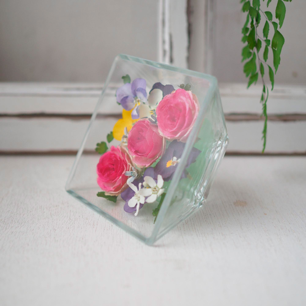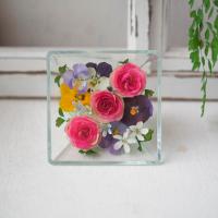 一番綺麗な状態のバラやヴィオラなどを職人がひとつひとつ丁寧に特殊乾燥させ、花本来の色合いのままガラスボトルの中へ閉じ込めました。長く楽しめるボトルフラワーはお花の好きなお母さまにおすすめです。