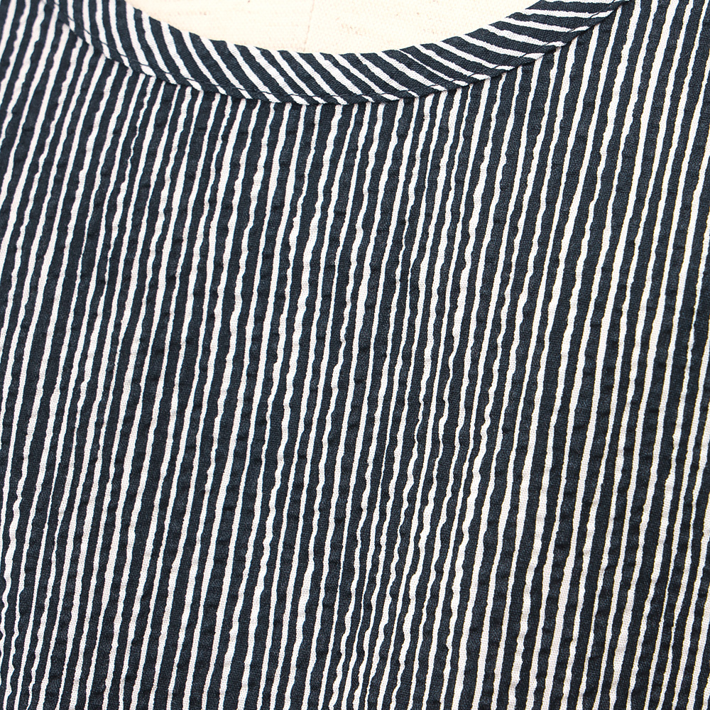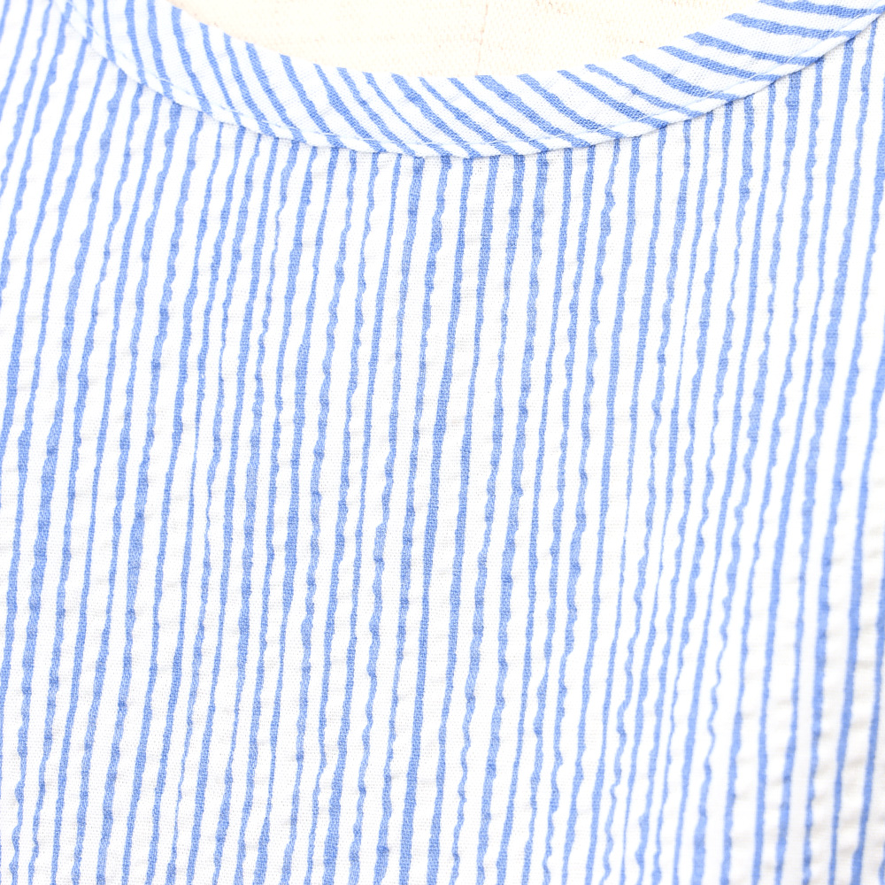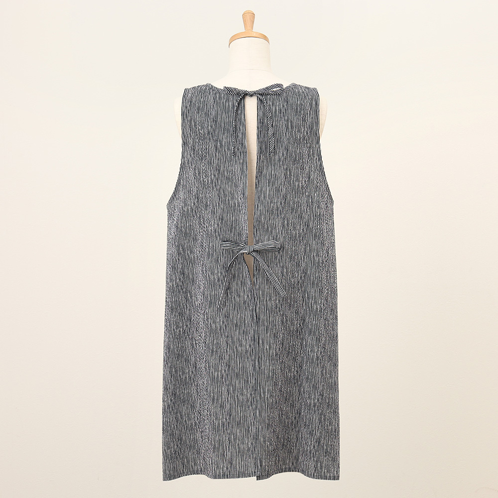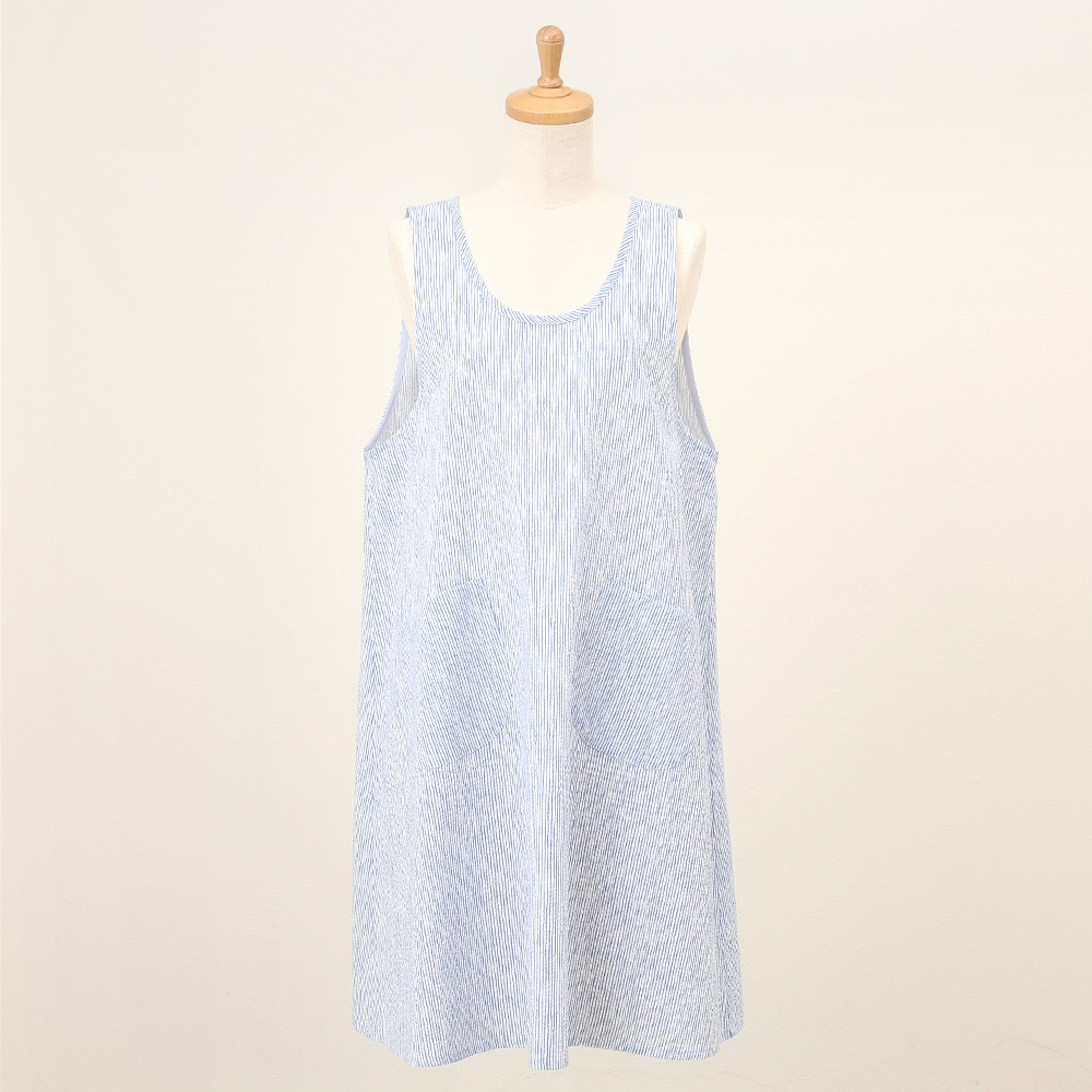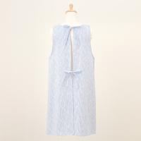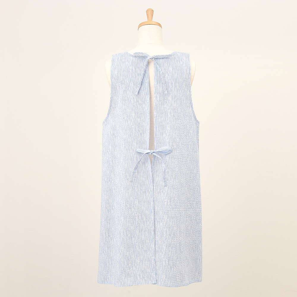 表面に凹凸があり、さらっとした肌触りが特徴のリップル加工素材を使用したエプロン。ゆったりとしたAラインシルエットと涼しげなブルー系カラーを組み合わせたエプロンは暑い季節にも重宝する一枚です。