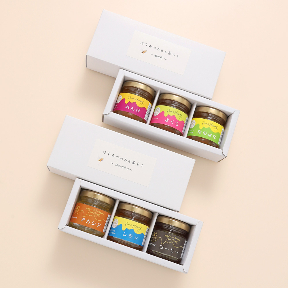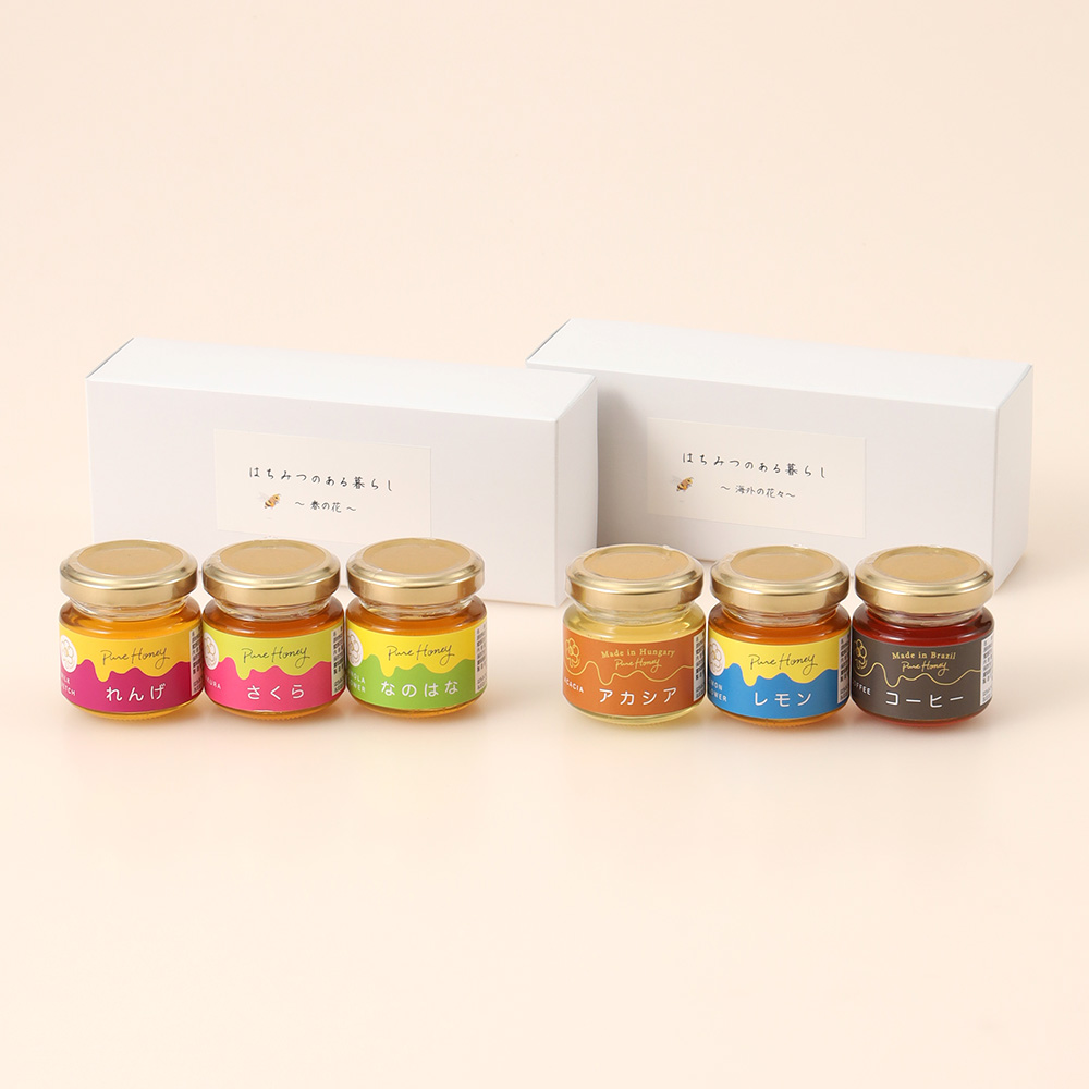 国産れんげ蜂蜜50g×1本、国産さくら蜂蜜50g×1本、国産菜の花蜂蜜50g×1本、ハンガリー産アカシア蜂蜜50g×1本、スペイン産レモン蜂蜜50g×1本、ブラジル産コーヒー蜂蜜50g×1本