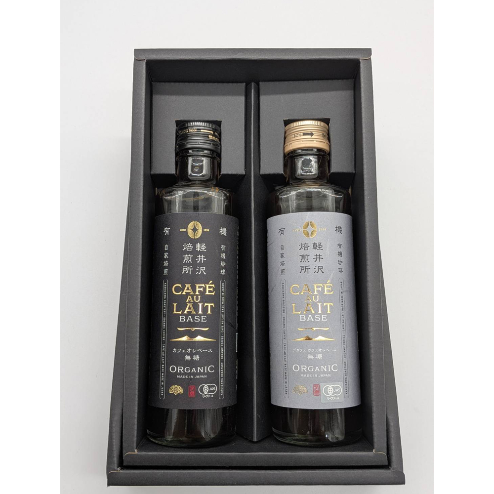 軽井沢焙煎所が仕立てた簡単に美味しいカフェオレができるオーガニックカフェオレベースが2種類入っているギフトです。その日の時間と気分に合わせて、やさしく飲み分け。カフェイン入りとデカフェ、それぞれ無糖のセットです。
