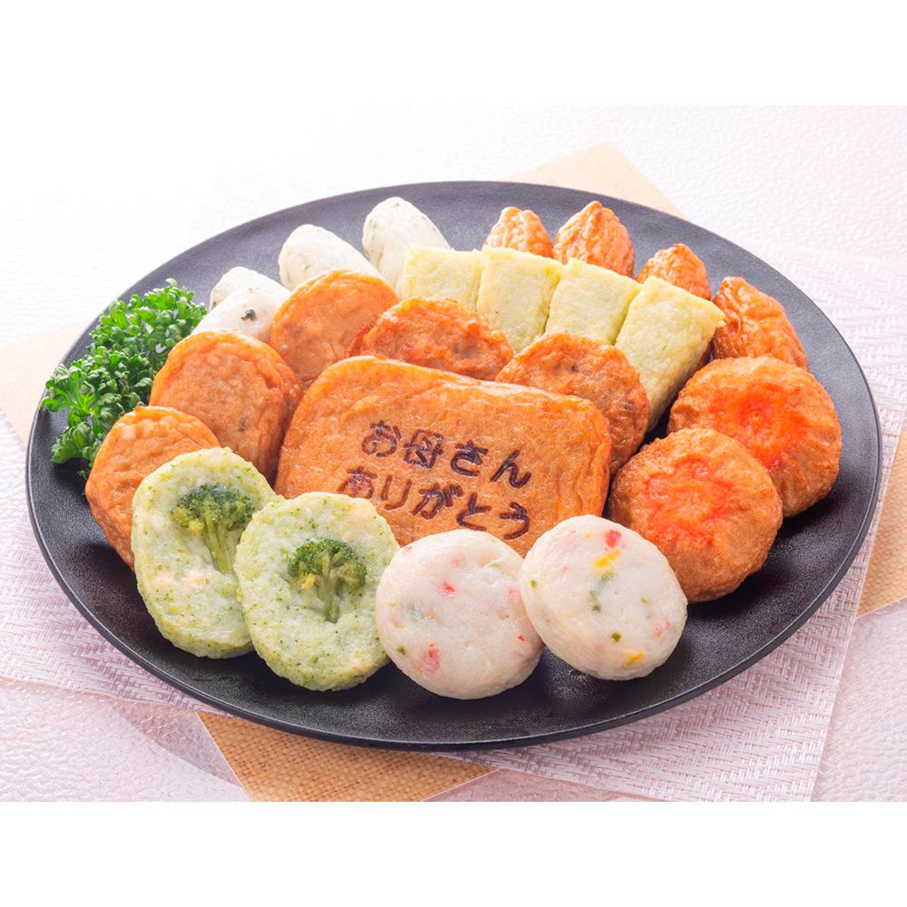小田口屋のさつま揚げは、ほんのりと甘く、豆腐や山芋などを用いたソフトな食感が特徴です。「お母さんありがとう」の文字天と彩り野菜を用いて仕上げました。母の日専用化粧箱でお届けします。