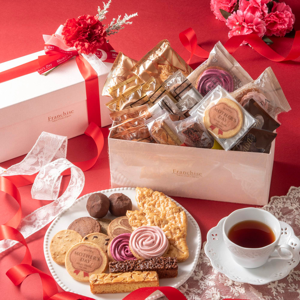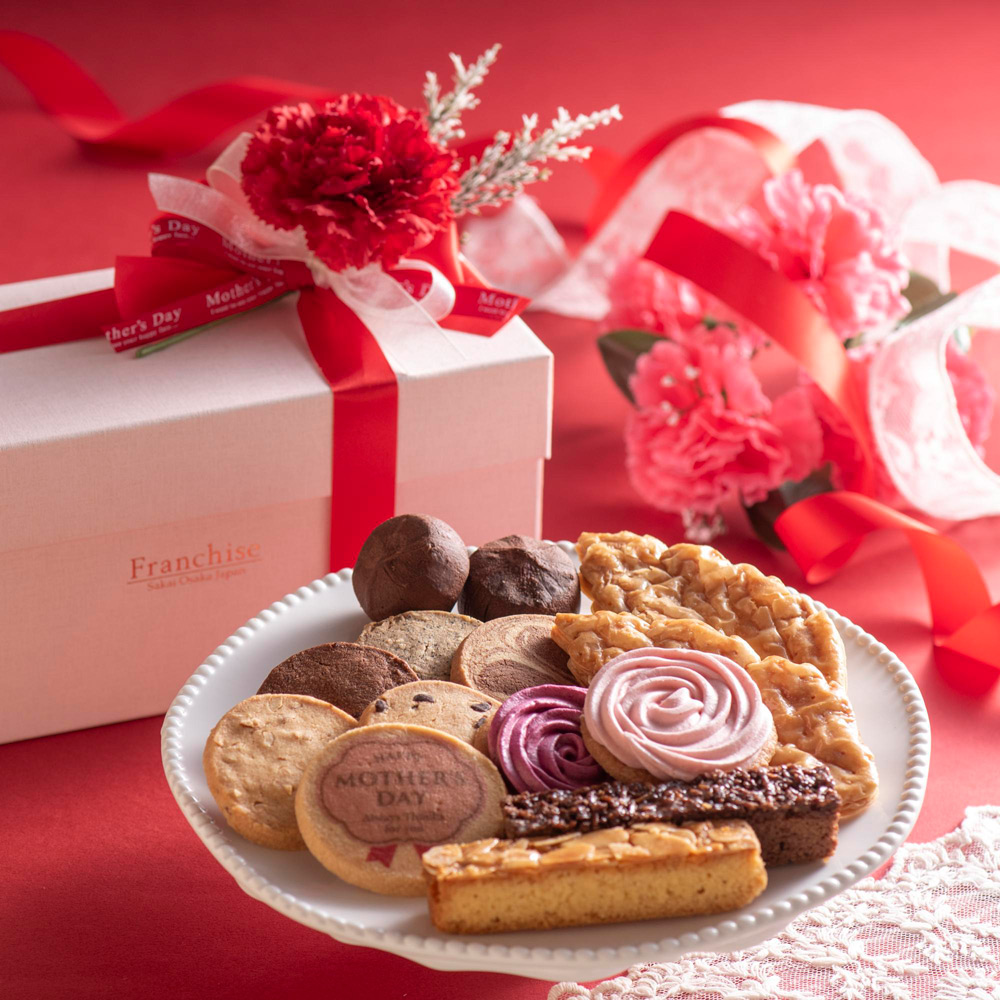 クッキー10枚、木の葉2枚、ロゼッタ2枚、ショコロン2個、母の日プリントクッキー1枚、フロランタン1本、ココショコラ1本